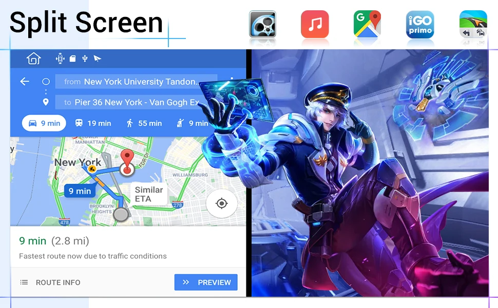 Он поддерживает сплит-экран, который запускает два разных приложения бок о бок, вы можете наслаждаться Spotify и Google Maps на экране.Примечание: Не все приложения поддерживают сплит-экран, Функция PIP работает только с Google Maps и VLC Media Player.