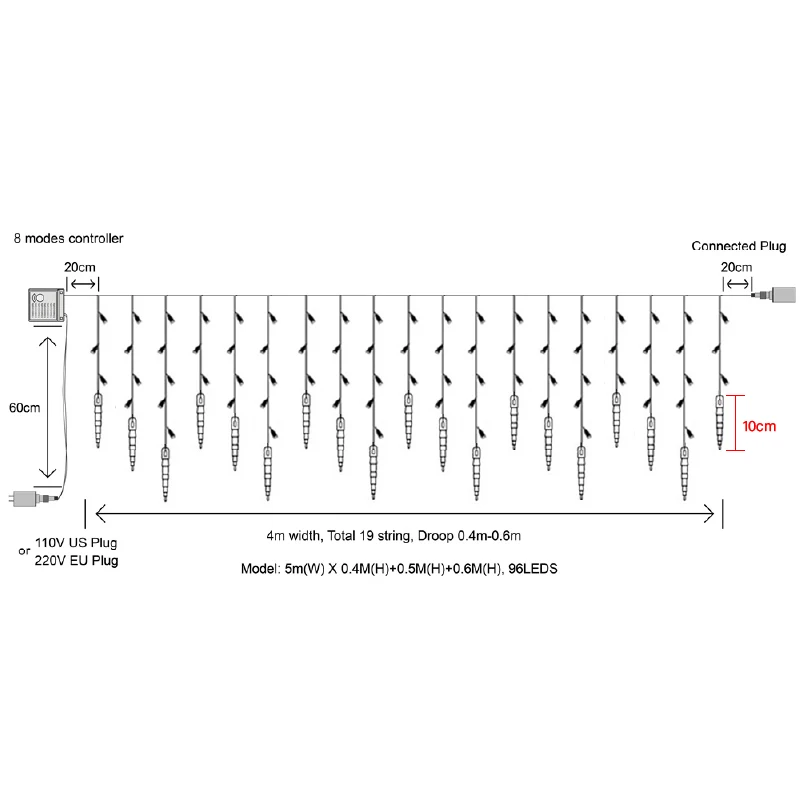 Рождественский светильник s гирлянда LED сосулька Фея занавес светильник 5 м 10 м 20 м водопад Дом Рождество Новый год Хэллоуин Сад Патио Украшение Спецификация: 5M X 0,6 м/0,5 м/0,4 м 96LED; Комплект из двух предметов Напряжение: штепсельная вилка европейского стандарта AC220V/штепсельная вилка стандарта США 110 В Количество капель: 19 струн линии капель. Количество СВЕТОДИОДНЫЙ: 96 шт. Размеры: 5 м (Ш) х 0,4 м (H)/0,5 м (H)/0,6 м (H) Материал: ПВХ кабель и медная проволока Разъем к разъему: всего 5 метров в длину Цвет кабеля: прозрачный белый 8 режимов: Есть 8 режимов Режим 1: комбинация Режим 2: в волне Режим 3: последовательный Режим 4: медленное свечение Режим 5: чеканка/вспышка Режим 6: медленное выцветание Режим 7: мерцание/вспышка Режим 8: устойчивый Примечание: Водонепроницаемый уровень стабильного на контроллере IP65, но для 8 режимов контроллера является IP44, поэтому 8 режимов контроллера должны защищать при использовании на открытом воздухе.