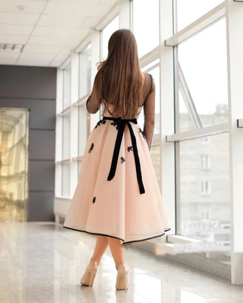Сексуальные женские розовые платья для выпускного вечера с высоким воротником и длинным рукавом, вечернее женское платье, ТРАПЕЦИЕВИДНОЕ черное кружевное Прозрачное платье с аппликацией
