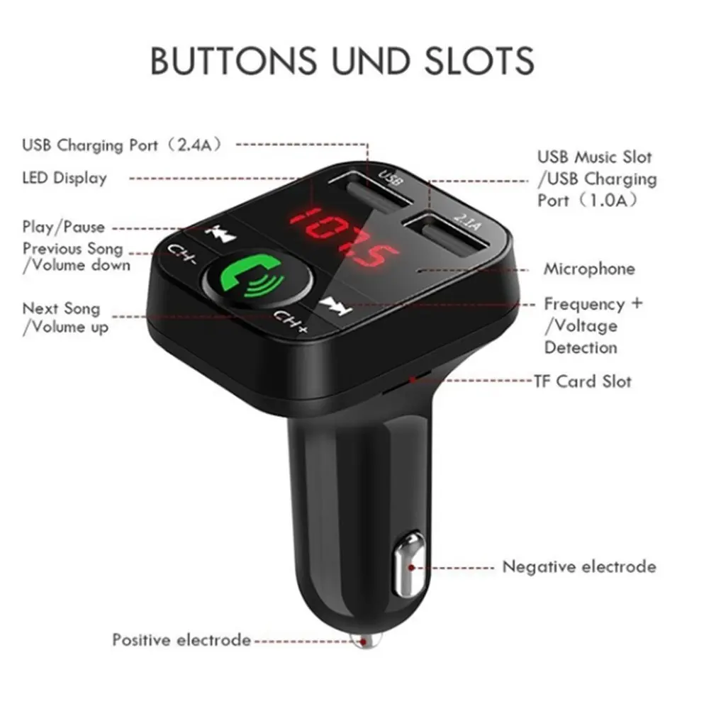 Автомобильный fm-передатчик поддерживает беспроводной ответ на звонки и воспроизведение музыки, со встроенным микрофоном и 2 usb-портами для зарядки.