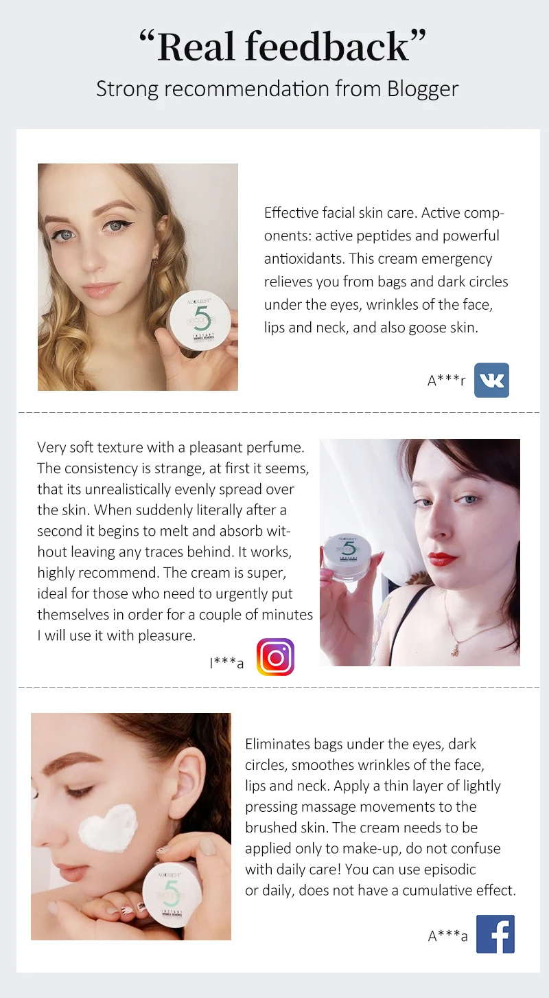 1. Уменьшает морщины и отёк глаз временно всего за 5 секунд.2. Мгновенные эффекты, которые длятся до 8 часов, в зависимости от человека, обеспечивают вам затягивающий эффект и создает немедленное поднятие на кожу.3. Тонизирует и подтверждает кожу, делая ее более молодой.4. Без масла Легкая формула для всех типов кожи, не вызывает акне.