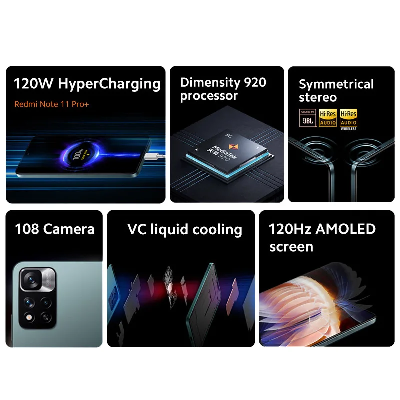 Процессор------------- Восьмиядерный процессор Dimensity 920Экран---------- 6,67 ''AMOLED DotDisplay, 2400x1080 FHD +, частота обновления экрана 120 Гц, частота дискретизации при касании 360 ГцRAM + ROM------ 6 ГБ + 128 ГБ/8 ГБ + 128 ГБ/8 ГБ + 256 ГБКамера-------- 108MP + 8MP + 2MP Тройная задняя камера, фронтальная камера 16MPБатарея--------- 4500 мАч (Typ) батарея, 120 Вт Быстрая зарядкаОС--------------- MIUI12.5,Поддержка нескольких языков, Google Play, но не может обновлять OTA
