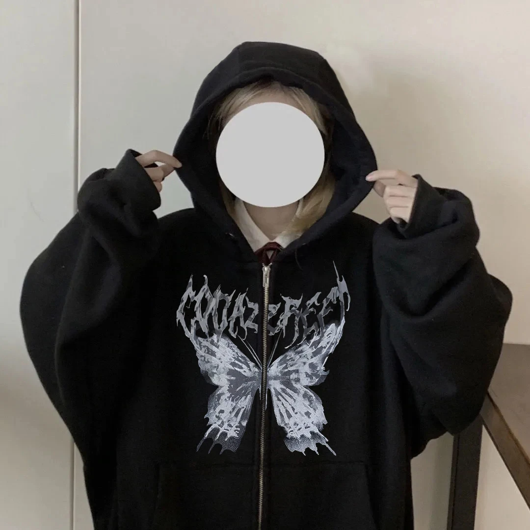 Женские толстовки в стиле панк, хип-хоп, Харадзюку, Осень-зима, на молнии, в эстетике бабочки, Y2k, винтажный свитшот с капюшоном, женская готическая куртка, пальто