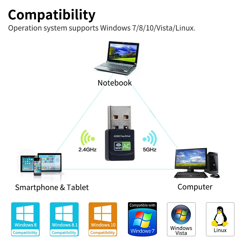 Характеристики:1. Чипсет: Realtek 88112. Тип интерфейса: USB 2 .03. Диапазон частот: 2,4 ГГц + Wi-Fi 5 ГГц4. Скорость передачи данных: 600 Мбит/с (11N:150 Мбит/с, 11AC:433 Мбит/с) 5. Стандарты: IEEE 802.11AC, 802.11b, 802,11g, 802.11n6. Размер: 29*15*7 мм7. Кнопка: WPS8. Напряжение: DC5Vplusmn5 %9. Светодиодный индикатор: Link/ACT10. Поддерживаемые ОС: Windows XP/Vista/WIN 7/8/10/LINUX/Mac OSПосылка включает в себя:1 х беспроводной usb-адаптер 600 Мбит/с