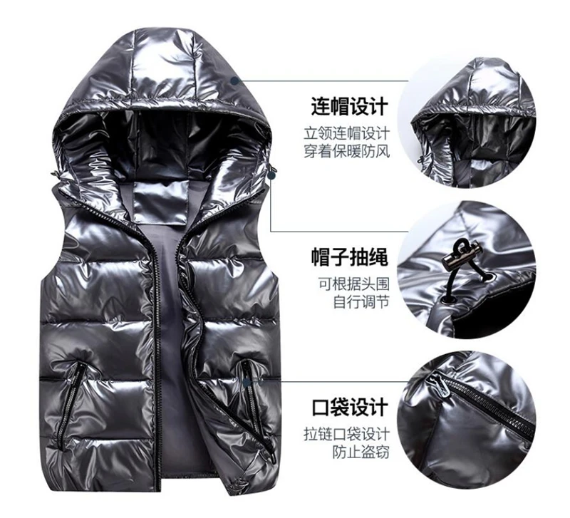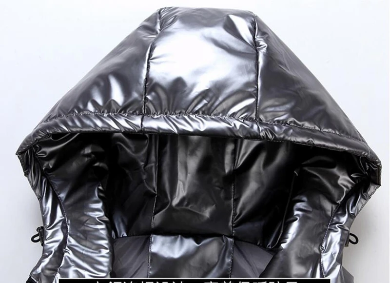 Жилет женский осенне-зимний, без рукавов, с капюшоном, блестящий