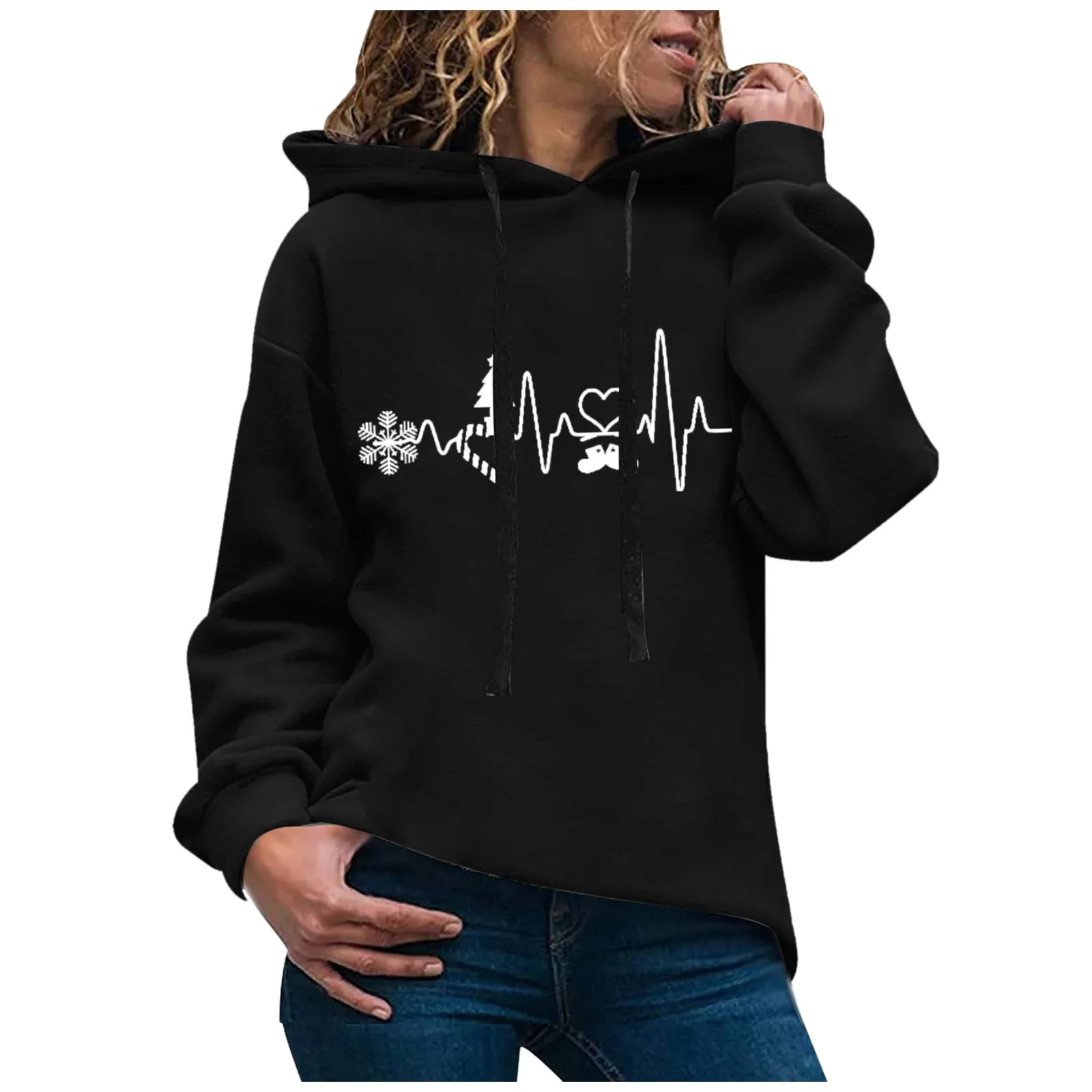 Осенне-зимняя женская толстовка с капюшоном с изображением сердцебиения рождественской елки толстовки с длинными рукавами Повседневная одежда худи оверсайз