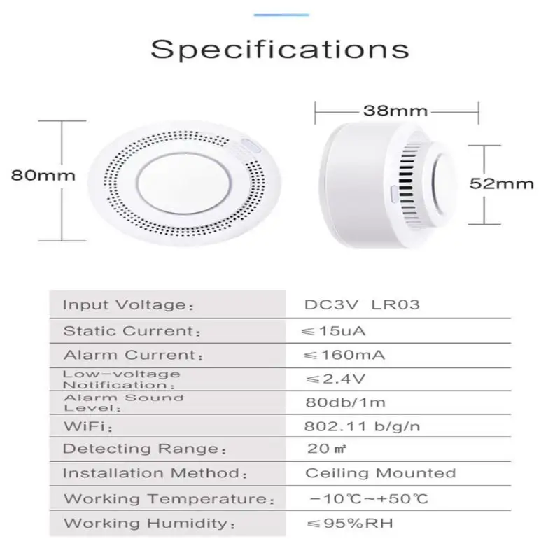 [Обнаружение дыма высокой чувствительности] Когда происходит пожар, датчик будет чувствительно обнаруживать дым, отправлять сигнал тревоги, а затем нажимать уведомление на ваш смартфон, чтобы защитить людей и свойства.