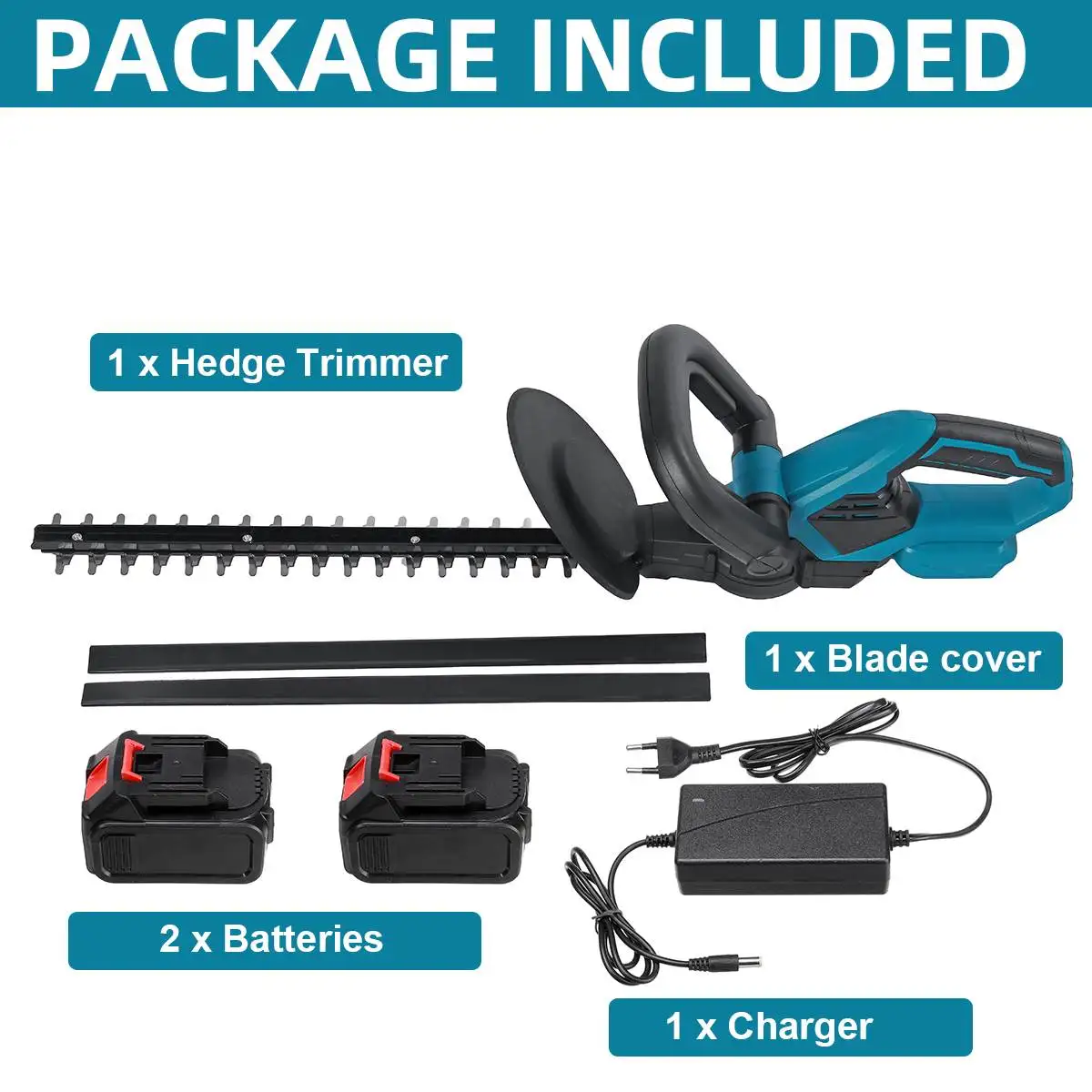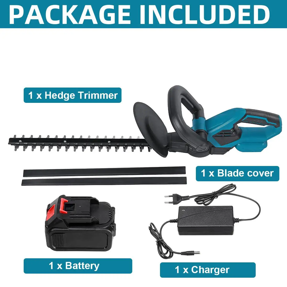 Упаковка включает:1 x триммер для изгороди1 x крышка лезвияБез батареи/1x/2x батареи1 зарядное устройство (только аккумулятор)