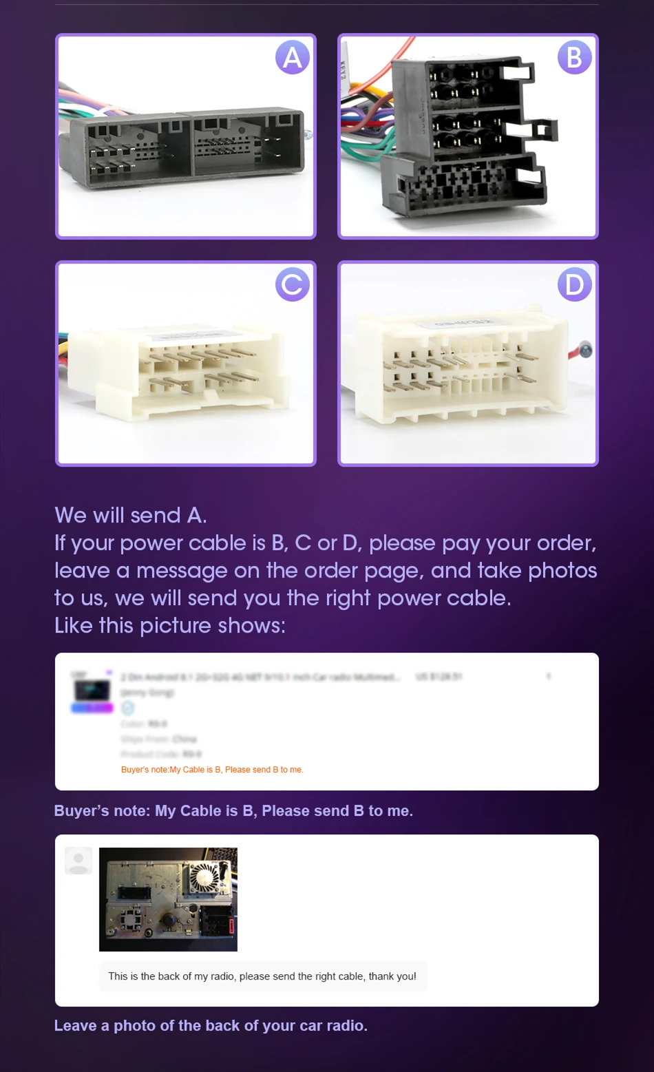 Обратите внимание: по умолчанию мы отправляем кабель A. Если вам нужны другие кабели, вы можете отметить их или оставить нам сообщение в заказе.