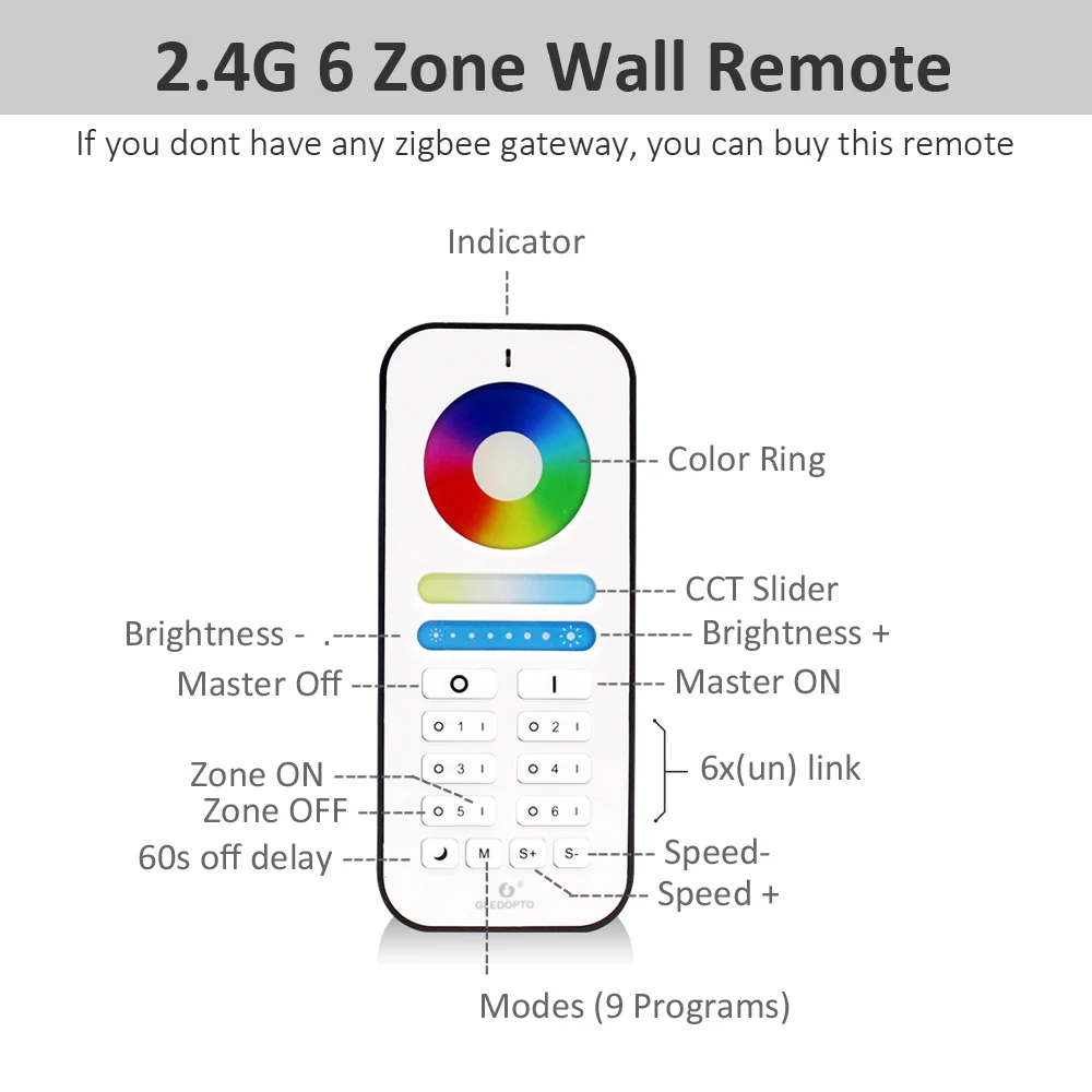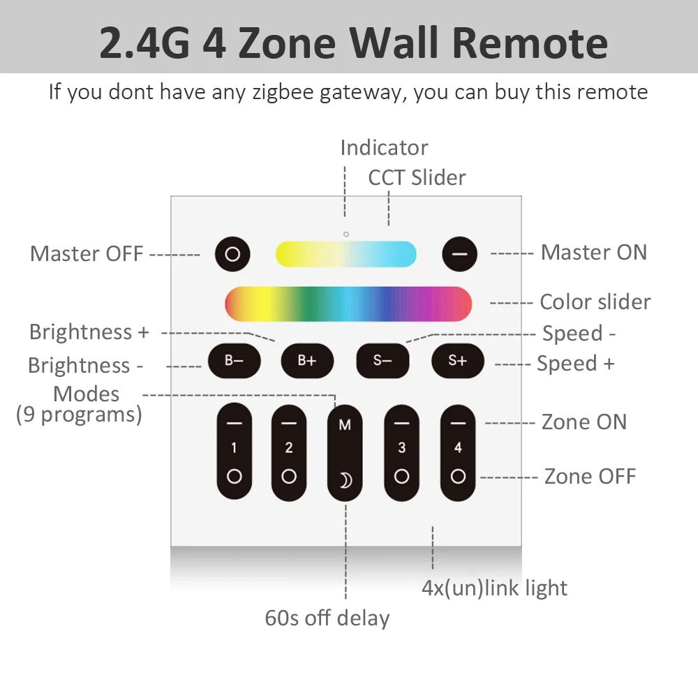 *** Пожалуйста, обратите внимание, что для наших устройств zigbee (продукты версии Zigbee/Pro) требуются соответствующие шлюзы zigbee.*** Если у вас нет шлюза, пожалуйста, купите один пульт дистанционного управления 2,4G RF или настенный переключатель для работы с продуктами версии Plus/Pro.Пульт дистанционного управления и настенный выключатель 2,4G RF, работает только с продуктами версии Plus/ Pro. (Не ZigBee)*** Обратите внимание, что контроллер серии Pro имеет четыре модели в RGBCCT/RGBW/WWCW/Dimmer.1) RGBCCT: RGB + теплый белый + холодный белый;2) RGBW: RGB + теплый белый;3) WWCW: теплый белый + холодный белый;4) Диммер: Регулировка яркости только от 1%-100%.*** Pro RGBCCT контроллер покажет 1ID в приложении, легко управлять светильник s, цвет (RGB) и белый светильник настраиваются отдельно.