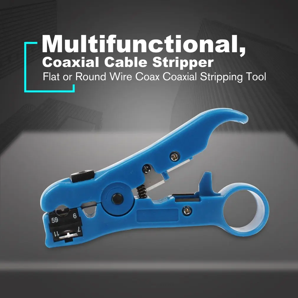 Особенности:1. Многофункциональный, может зачистки и резки кабеля.2. Вращающийся соединитель вмещает круглые и плоские кабели.3. Глубина лезвия может быть легко отрегулирована, подходит для большинства круглых кабельных поворотных лезвий регуляторов.4. Встроенная пружина, легко снимается; Ручка с кольцом, легко носить с собой.5. Обжимные коаксиальные кабели: Mini-coax, RG59, RG11, RG7, RG6, 75-5, 75-7, 4P, 6P, 8P, UTP, STP круглый и плоский кабель и 3,2-9,0 мм Мульти-кабель передачи.