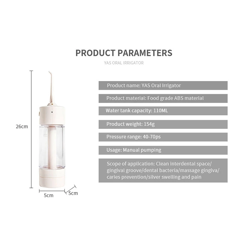 Характеристики: легко установить на раковины и в душеПростая в использовании кнопка включения/выключения в секундуЛегко регулировать температуру и давлениеЛегко носить с собой в поездкахФункции ирригатор для гигиены ротовой полости:Освежает дыханиеОбеспечивает плавностьУдаляет мусор и уменьшает бактерииУлучшает здоровье десенОчищает брекеты, мосты, короны и имплантатыМожет достигать всех точек солодаСпецификация:Название продукта: YAS ирригатор полости ртаИсточник питания: неэлектрический; Ручное давлениеЕмкость: 110 млДиапазон давления: 40-70PSIКак использовать: ручные насосыЦвет: белыйМатериал: АБС-пластикРазмеры: 26x5x5cmПосылка:1 * устройство ручной промывкиТолько вышеуказанная посылка, другие товары не включены.Примечание: светильник и различные дисплеи могут привести к тому, что цвет товара на картинке немного отличается от реального. Допускается погрешность в измерениях +/- 1-3 см.