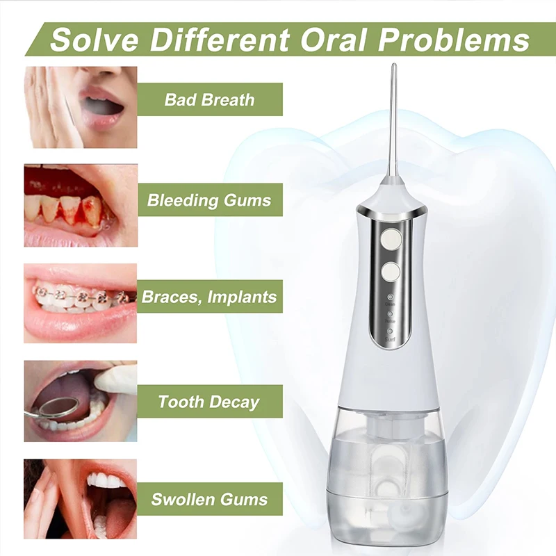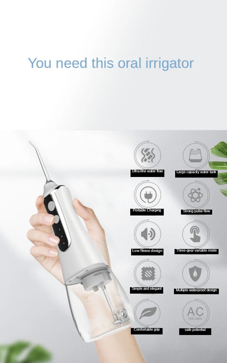 1. Название продукта: 100% новый бренд ирригатор полости рта для взрослых2. Модель: LR-63. Материал корпуса: 100% высококачественный АБС-пластик4. Материал резервуара для воды: 100% высококачественный ПК5. Характеристики: многофункциональный al / IPX7 водонепроницаемый/5 регулируемых режимов работы/сильное давление воды/удобная портативная USB зарядка/Съемная большая емкость 300 мл резервуар для воды/5 x различных функциональных насадок, 1 x головка зубной щетки/вращающиеся насадки на 360 °/уникальный дизайн гравитационного шарика/Водонепроницаемая вилка и пылезащитная вилка6. Сертификация: CE / FC / FDA7. Входное напряжение адаптера питания: Совместимо с мировым напряжением (100-240 В)8. Вход: 5 В/1 а постоянного тока9. Выход: 3,7 V / 5 Вт10. Частота: 50 / 60 Гц11. Тип резервуара для воды: Съемный большой объем 350 мл резервуар для воды12. Частота импульса: 1200 раз/мин13. Диапазон давления воды: 30-110 PSI14. Тип батареи: перезаряжаемая литиевая батарея 2000 мАч15. Режим зарядки: удобная портативная зарядка через USB16. Время зарядки: 5 часов17. Время работы полностью заряжено: 12 дней (работает два раза каждый день) или непрерывная работа 80 минут18. Посылка Размеры/педикюра задняя часть: около 25 см х 12 см х 7,5 см