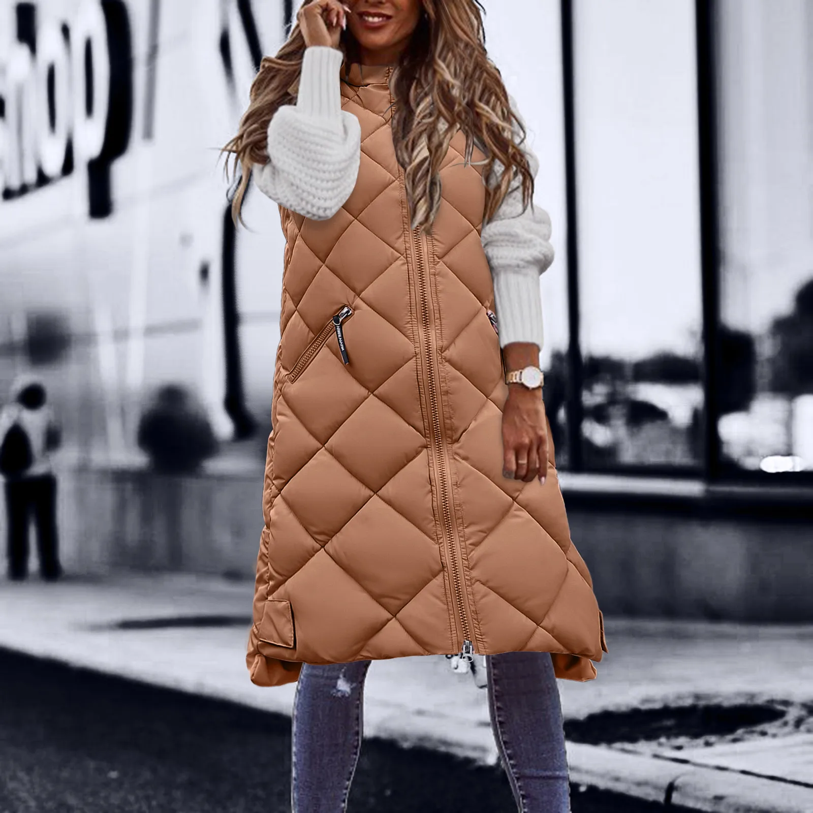 Женский Длинный Зимний пуховик, теплый пуховик без рукавов с капюшоном, стеганый пуховик с карманами, Женские ветрозащитные пуховики, верхняя одежда
