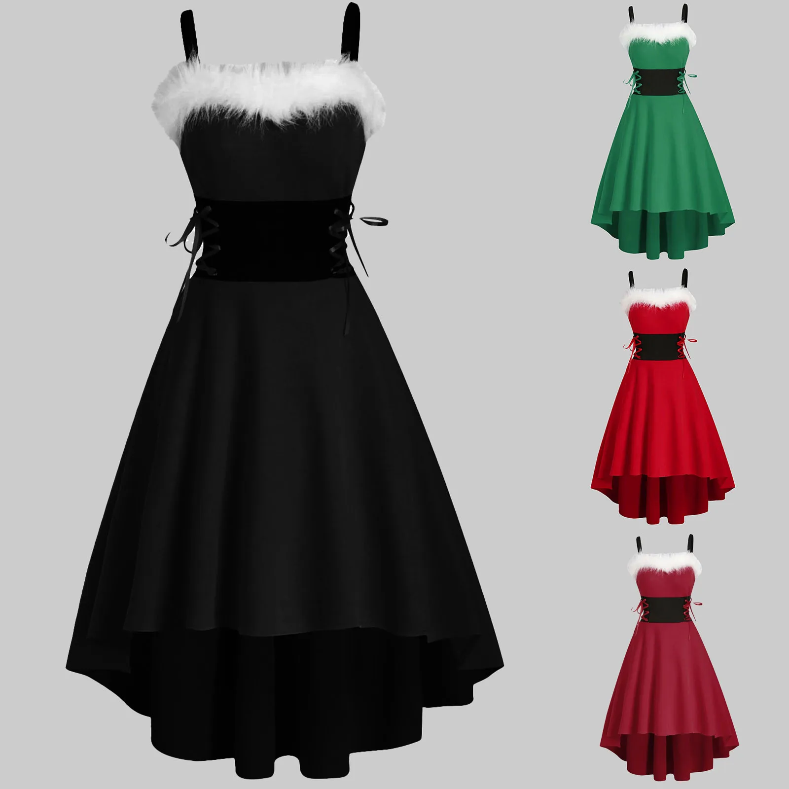Женское рождественское асимметричное платье средней длины с открытыми плечами и шнуровкой из искусственного меха, костюм для женщин, одежда для женщин