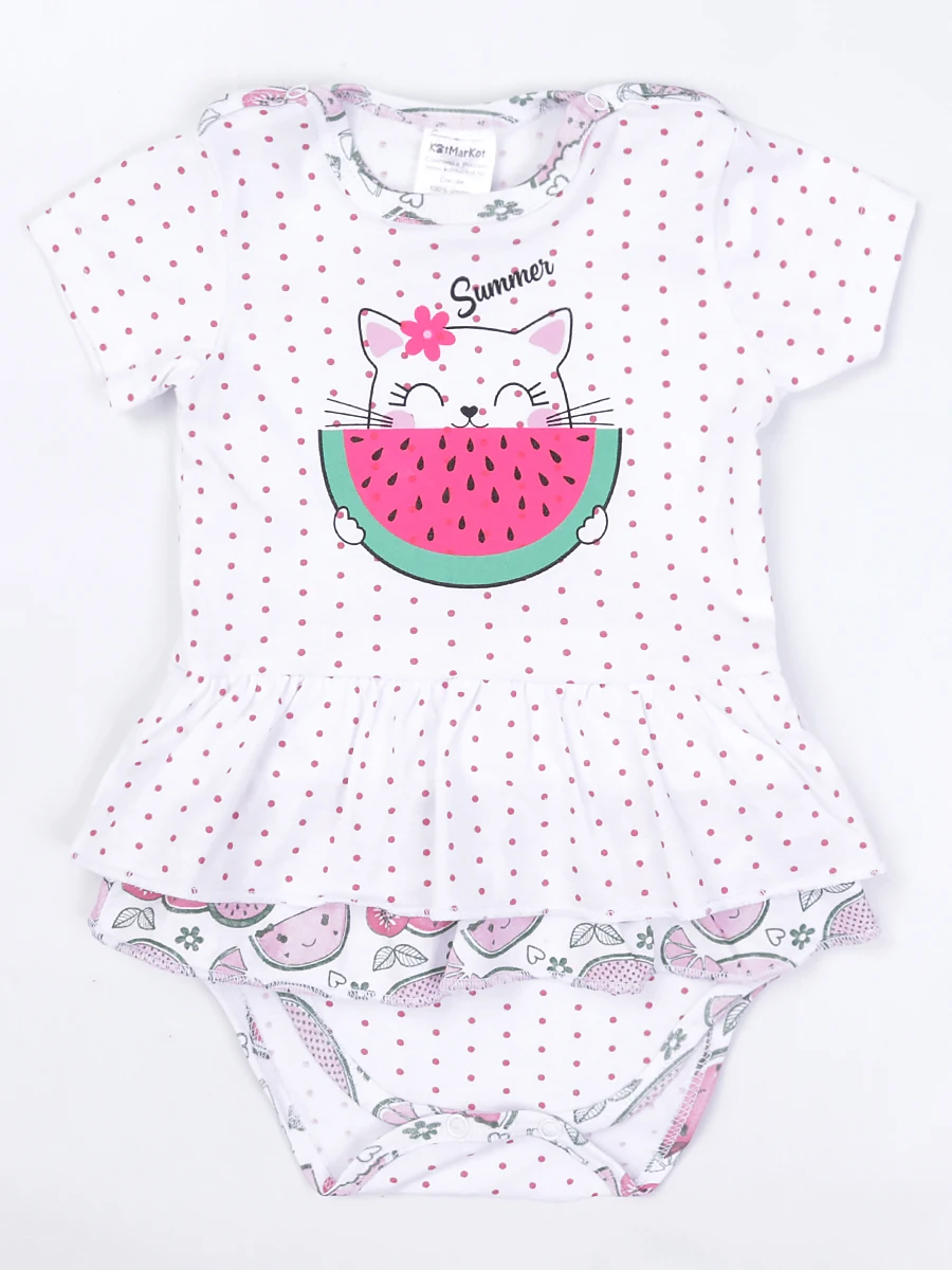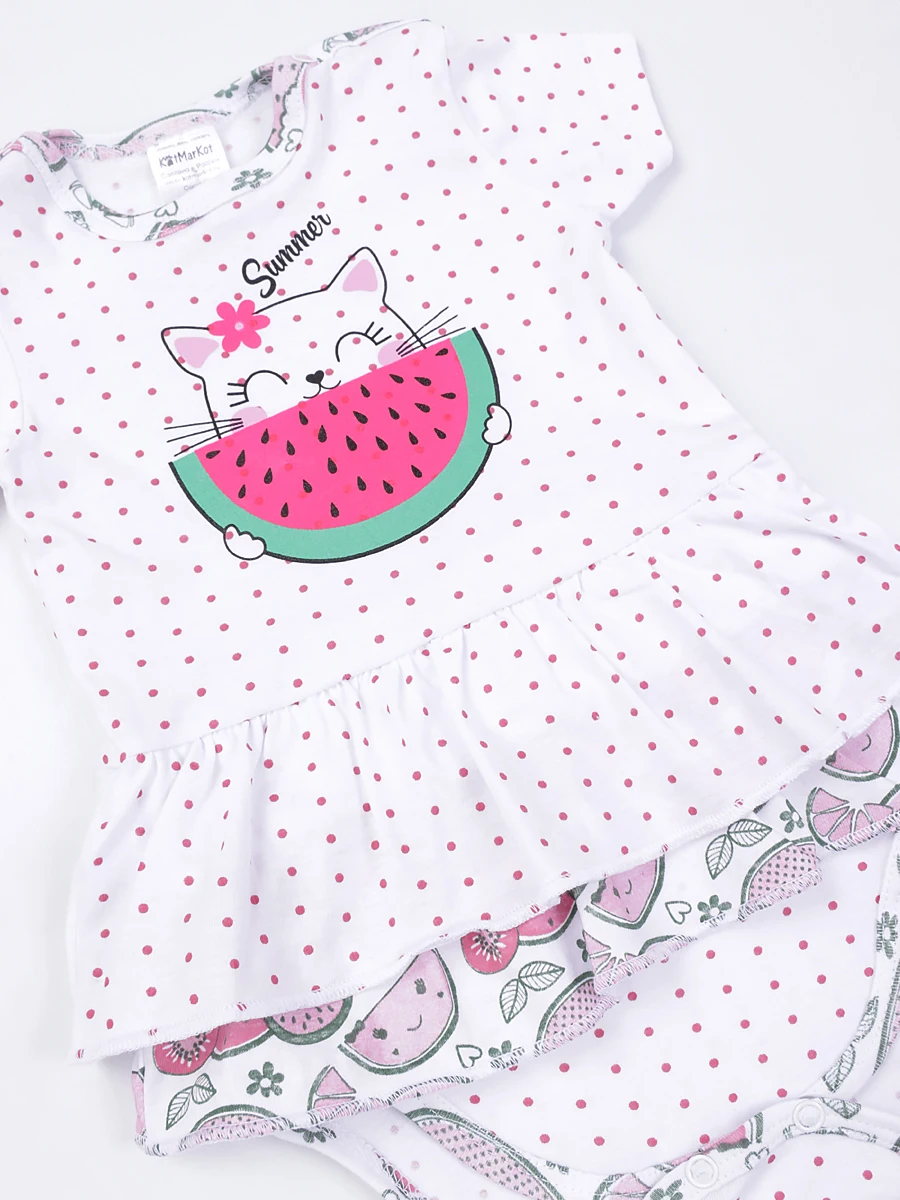 Самым любимым и самым дорогим – лучшие вещи. Легкий боди для новорожденной девочки из коллекции «Арбузики». Сшит из мягкого натурального 100% хлопка высочайшего качества (Кулирка), в котором принцесса будет чувствовать себя уютно и комфортно. Забавный бодик для малыша надежно закрывает паховую зону и защитит от переохлаждения. Главная фишка этого бодика – яркий принт на водной основе. Продуманный крой, мягкие швы, круглый вырез горловины, плоские кнопки-застежки, приятная ткань - в детском боди с коротким рукавом от КотМарКот предусмотрено всё! Прекрасная модель для новых образов на каждый день, которая будет идеально сочетаться в комплекте с другими вещами из одноимённой коллекции. Подарите малышу заботу и самые любимые вещи вместе с КотМарКот.