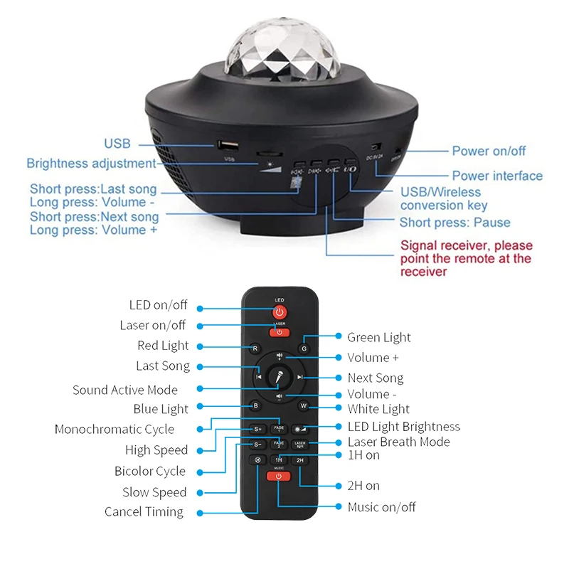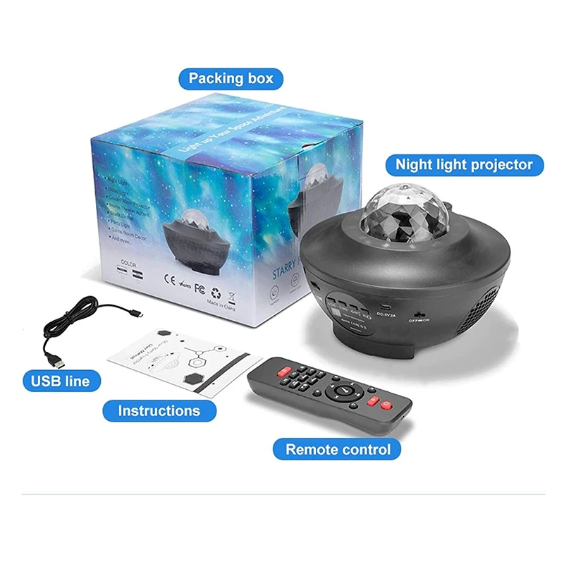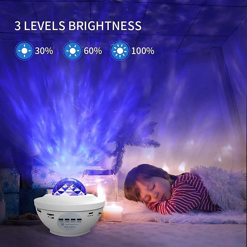 -- Функция Mlti-Projection effects & Timer: Проектор Galaxy для спальни отображает четыре варианта динамического цвета (синий/зеленый/красный/белый), создавая 10 видов визуальных эффектов sky lite. Звездный проектор Galaxy light представляет красочную ночную атмосферу на стенах и потолке. Создайте расслабленный или трехцветный интерьер комнаты. Опции: 1) Регулировка яркости 2) регулировка скорости волны океана 3) Настройка таймера
