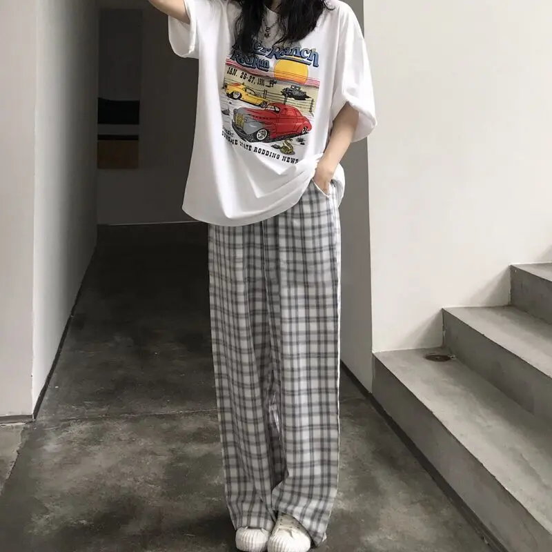 Женские брюки в клетку большого размера 3XL, повседневные свободные брюки с широкими штанинами, прямые брюки в стиле ретро для подростков, уличная одежда в стиле хип-хоп унисекс