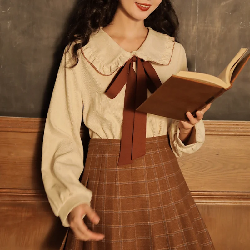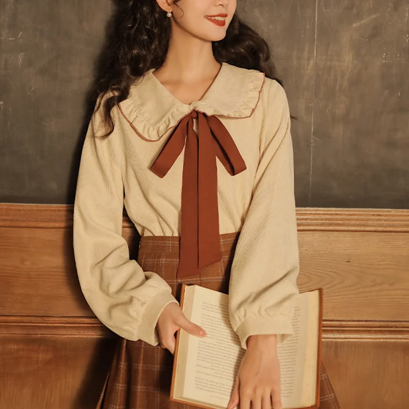 Вельветовые Kawaii рубашки для женщин с бантом Питер Пэн воротник блузка для подростков Осень 2021 форма с длинным рукавом на пуговицах женская одежда топы