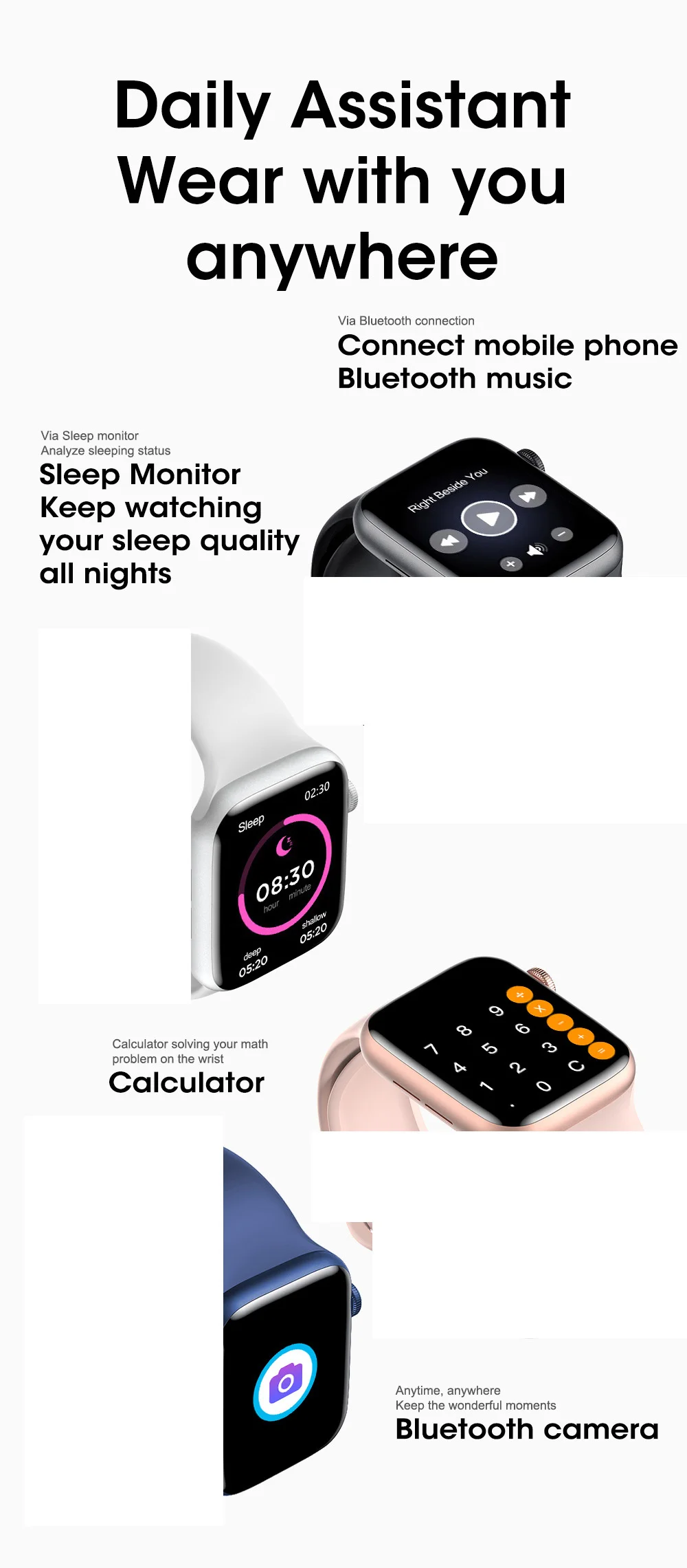 Отличительные особенности: IP68 Водонепроницаемый, 1,75 дюймов Дисплей экономит много энергии, низкое потребление, двойной режим Bluetooth, 2 кнопки.Основные характеристики:Загрузка лиц часов, Разделенный экран, блокировка контактов, вызов Bluetooth, частота сердечных сокращений, шагомер, несколько видов спорта, уведомленияПараметр:Платформа: Huntersun HS6621; Основная частота: 128 МГц; ОЗУ: 256кб; ПЗУ: 8 Мб + 64 МбСтандарт качества: GB4943.1-2011; ГБ/T22450.1-2008Чехол: вакуумное покрытие из сплаваРемешок: оригинальный 44 ммЗарядное устройство: беспроводноеЦвет: черный, серебристый, синий, розовое золотоДисплей: 1,75 дюймов TFT экран, 320*385 пикселейСенсорная панель: несколько касанийУведомления: звонки, электронная почта, SMS, WhatsApp, Wechat и т. Д.Частота сердечных сокращений: автоматический 24H мониторШагомер: Ежедневный подсчет шагов, подсчет калорийМонитор сна: объективная и научная количественная оценка для записи и анализа состояния сна, каждую ночь с 9 до следующего дня автоматически включаетсяBluetooth:BT 3,0 + 5,0Батарея: 230 мАч литий-ионный полимерный аккумулятор, 150 минут для полной зарядкиВибрация: Поддержка