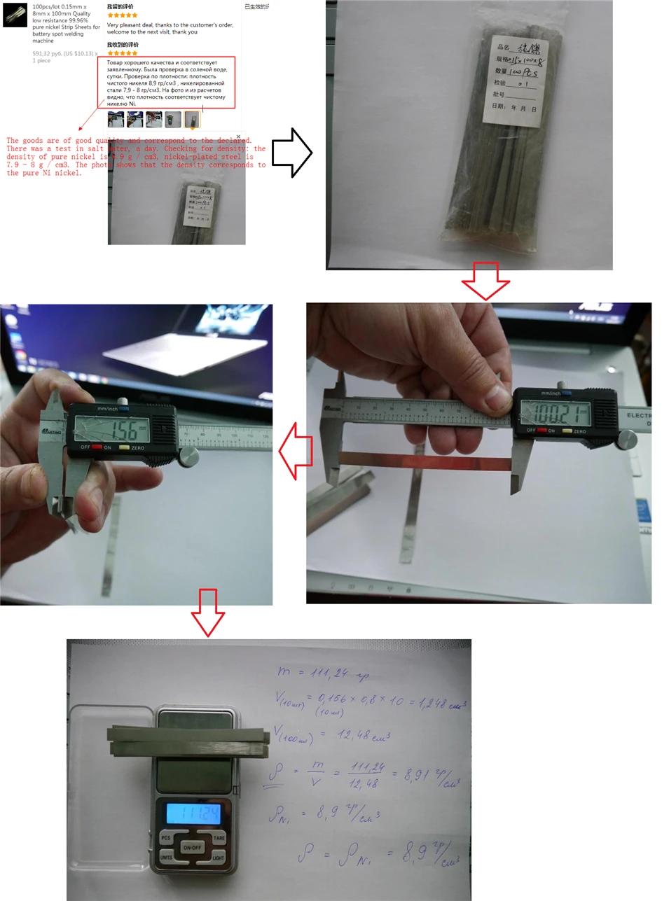 0,5-1 кг 0,15 мм * 10 мм Чистый Никель плиты ремень газа листы 99.96% чистый Никель для Батарея Свеча зажигания электрода машина для точечной сварки Особенности в хорошей производительности сварки, высокое натяжение, Низкое Удельное сопротивлениеВ основном используется для никель-металлических гидридных батарей, литиевых батарей, полюсных ушек, электроинструментов, комбинированных батарей, полимерных батарей, аккумуляторов и приборов, высокомощных электроинструментов, аккумуляторов, аккумуляторов для ноутбуков, аккумуляторы и HM сочетание телекоммуникации, вакуума, промышленностиСодержание никеля: >/= 99.96%Толщина x Ширина:0,15 мм x 10 мм Упаковка включает в себя: 0,5 кг x 0,15 мм x 10 мм чистые никелевые полоски. (как правило, 1-2 тома) Примечание: 1 у нас также есть другие размеры, если вам нужен другой размер, вы можете связаться со мной для этого. 2 данный продукт Чистый Никель, чистоту, 99.96%, это определенно не сталь никелированная, Россия, имеет покупателей плотность расчет рассчитаны плотность 8,9 г/мл замерить параметры может быть показано ниже.
