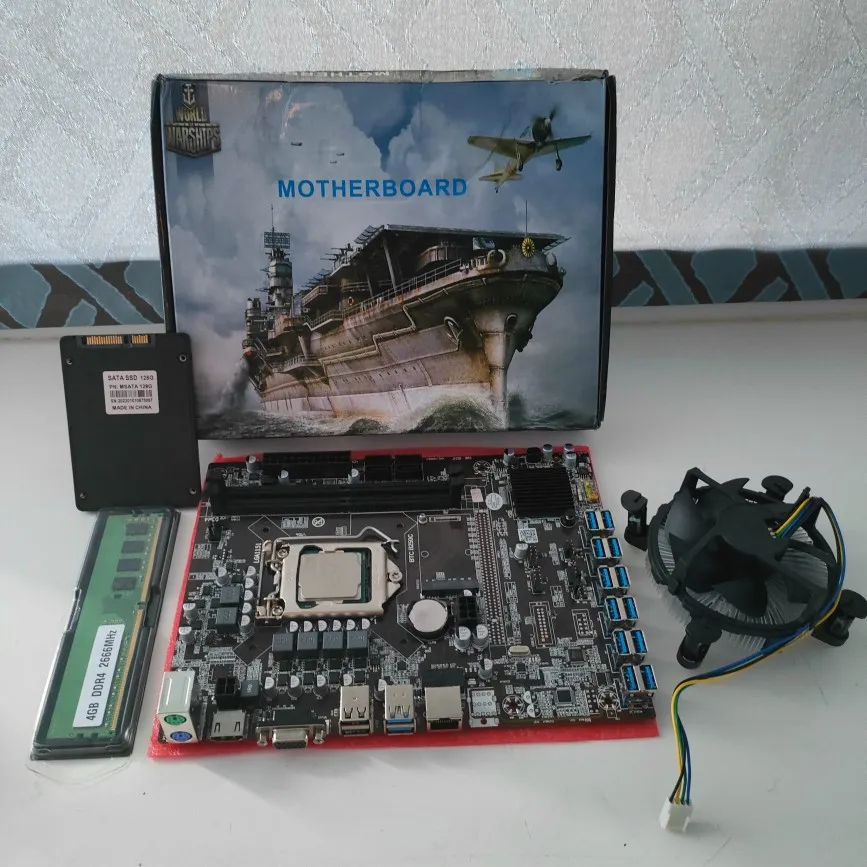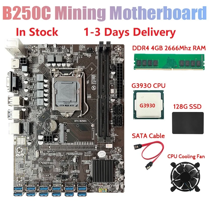 Материнская плата B250C для майнинга BTC + процессор G3930 + вентилятор + DDR4 4 Гб 2666 МГц ОЗУ + 128G SSD + кабель SATA 12 * PCIE в разъем для графической карты USB3.0