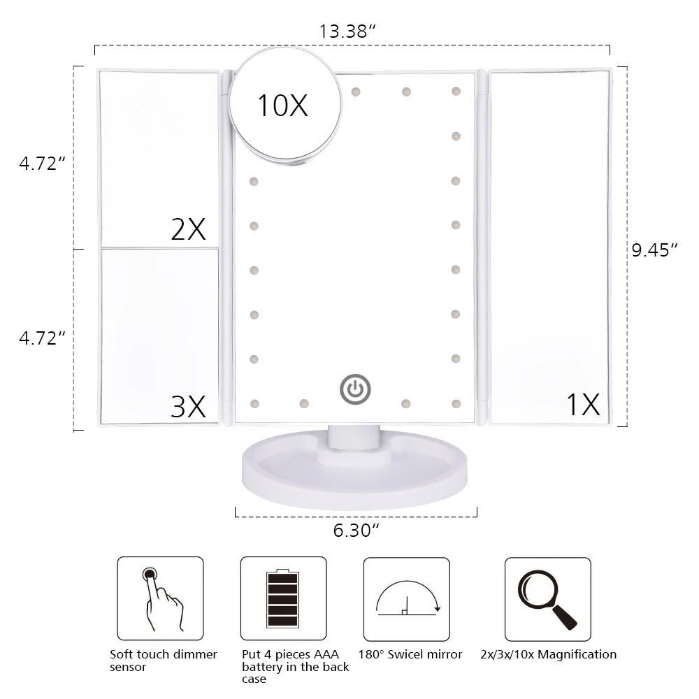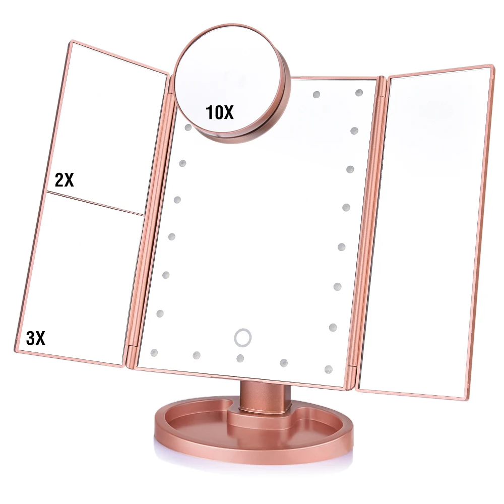 Зеркало для макияжа складное с сенсорным экраном, 22 светодиода, увеличение 1X, 2X, 3X, 10X