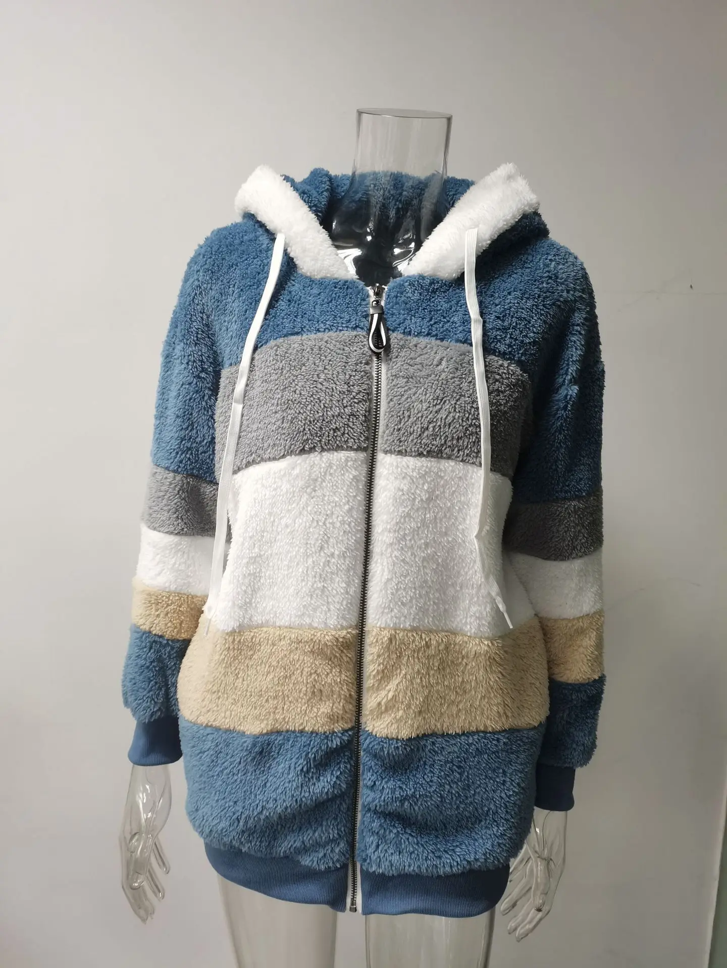 Женское Новое Стильное свободное плюшевое многоцветное пальто с кап...