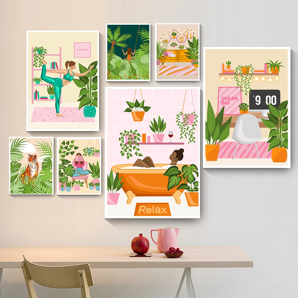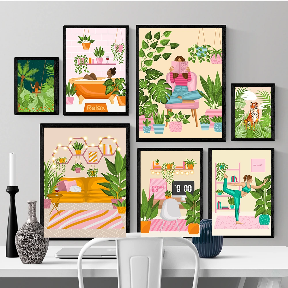 Настенная картина в стиле бохо для йоги, женщины, растения, монстера, холст, Внутренняя Живопись, скандинавские плакаты и принты, настенные картины для декора гостиной