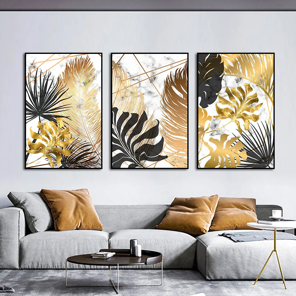 Набор из 3 абстрактных золотых листьев, Картина на холсте, современные плакаты и принты, настенные картины для гостиной, украшение для дома