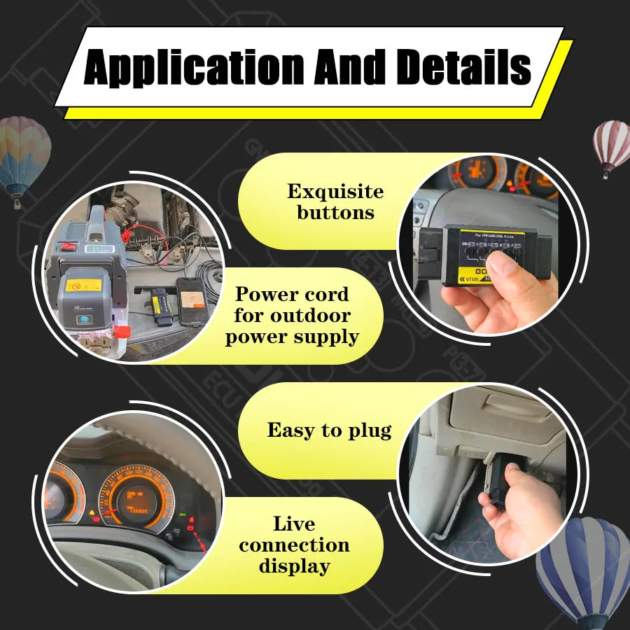 GODIAG ECU IMMO Prog AD GT105-это специальный Соединительный адаптер, разработанный для технического обслуживания автомобилей, противоугонных техников, инженеров по программированию ECU и т. д. Он используется для коротких замыканий OBD2 в автомобиле для противоугонной активации, диагностики и программирования ECU, а также для извлечения энергии из аккумулятора транспортного средства для наружного обслуживания на месте транспортного средства.