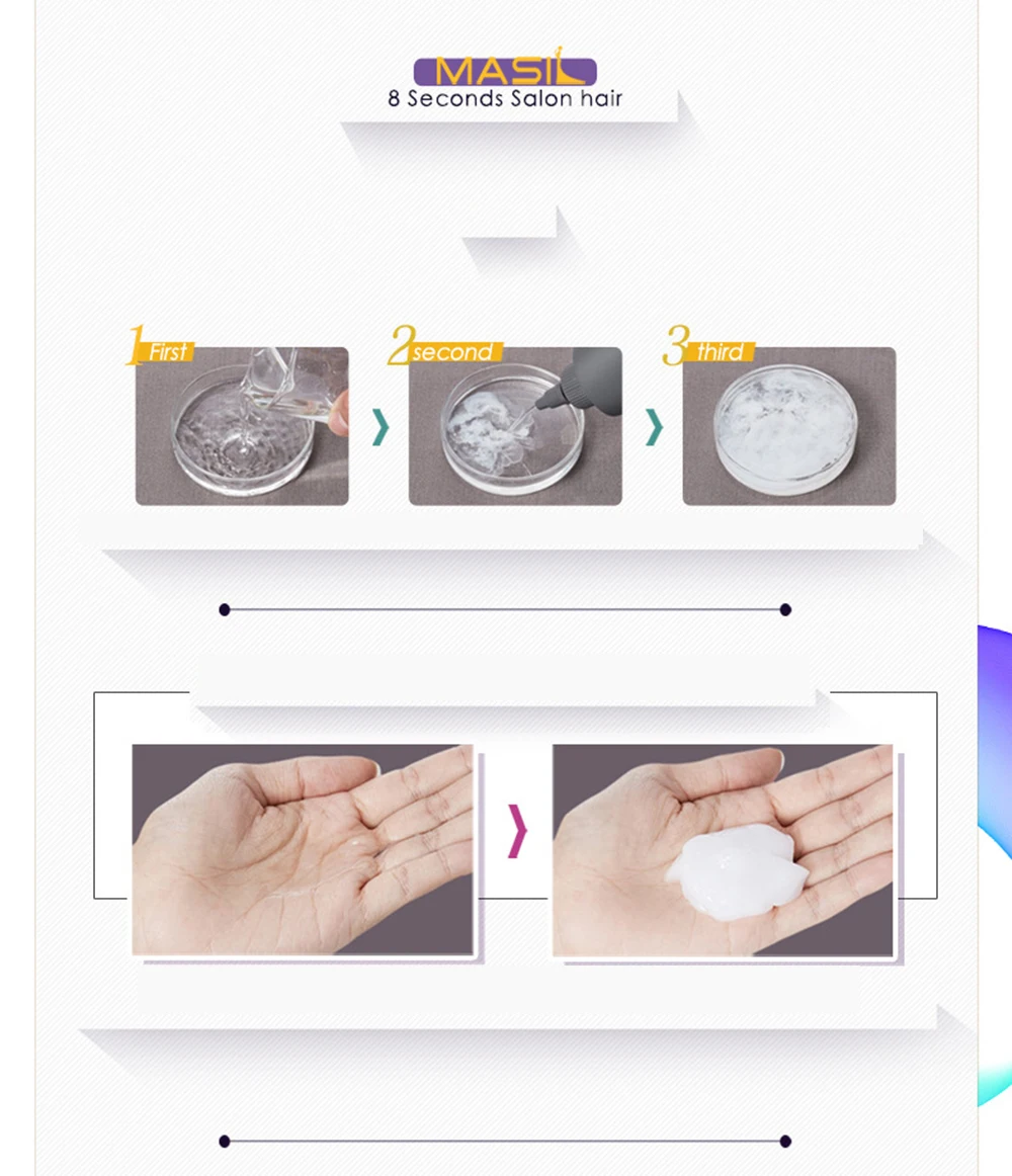 Инструкции:1. Налейте правильную воду в тот же сухой контейнер2. Налейте маску в течение 8 секунд3. Сочетание воды и маски для волос превращается в пасту(Жидкость, нанесенная на кожу головы и волосы, превращается в крем сразу после контакта с водой)