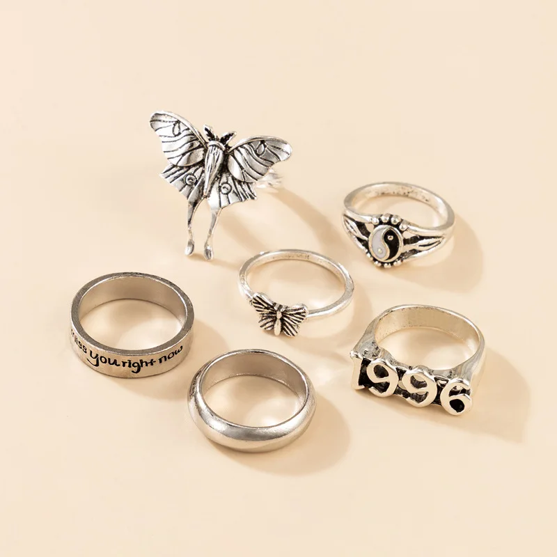6 шт./партия, ретро, преувеличенная Серебряная бабочка, кольца для женщин, индивидуальное, с буквенным номером, металлическое кольцо на палец, готическое ювелирное изделие