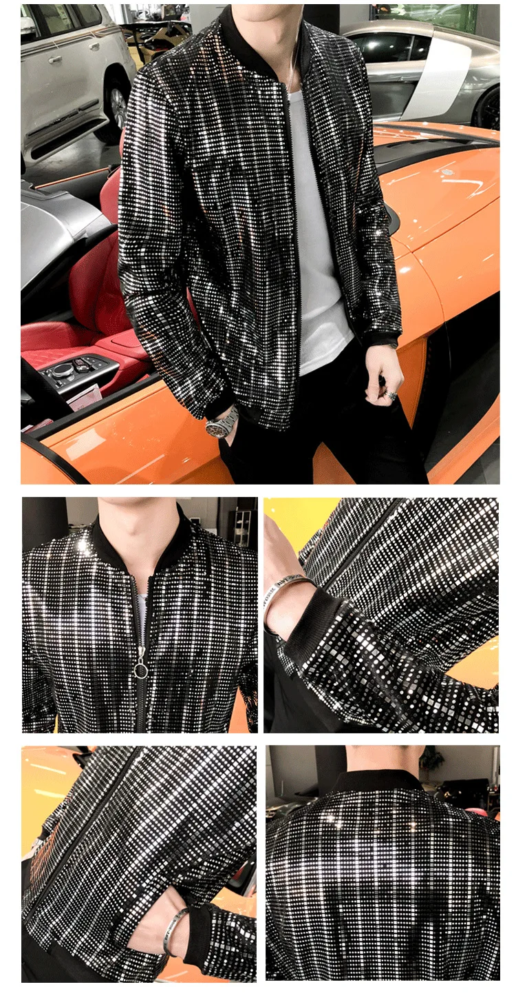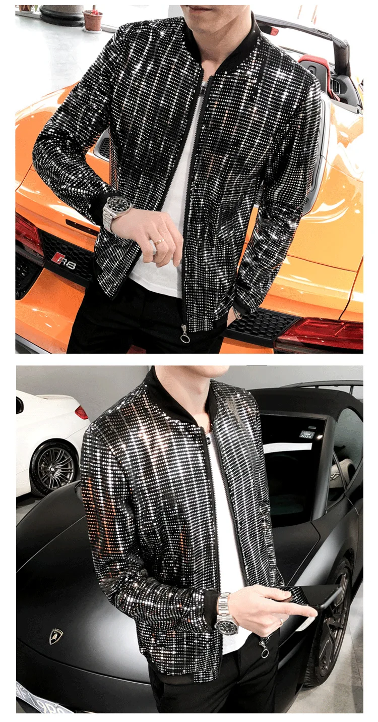 Куртка-бомбер мужская с блестками, тонкий пиджак на молнии с длинным рукавом, блестящая уличная одежда свободного покроя в стиле хип-хоп, для ночного клуба, для сцены, весна 2022
