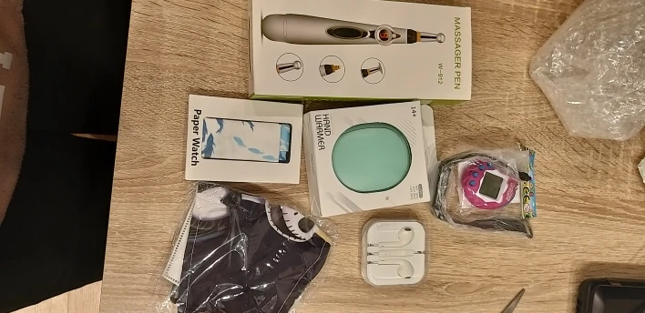 К сожалению, я очень разочарован. Я не ожидал, что бог знает что, но то, что я получил, кажется шуткой. 1. Ручка-массажер является просто очень дешевым пластиком и не работает. 2. Грелка для рук кажется нормальным, но я еще не разобрался. 3. Бумажные часы, на мой взгляд, бесполезно, я даже не могу надеть их на запястье, это очень неудобно. 4. Наушники, кажется, тоже в порядке, но idk. 5. «умный Браслет» без коробки или инструкции, не может даже закрепить его на своем запястье с помощью этого странного ремешка. 6. Тамагочи, я не знаю, что об этом подумать, я не могу действительно считать это настоящей электроникой, это просто игрушка. 7. Маска для лица? Действительно? Как это электронная вещь? Так что да, в целом я очень разочарован, не стоит тратить на это деньги. Даже если вещи отправляются случайным образом, это не означает, что люди должны получать чушь, потому что она должна была быть 100% высококачественной электроникой. Это большой no от меня.