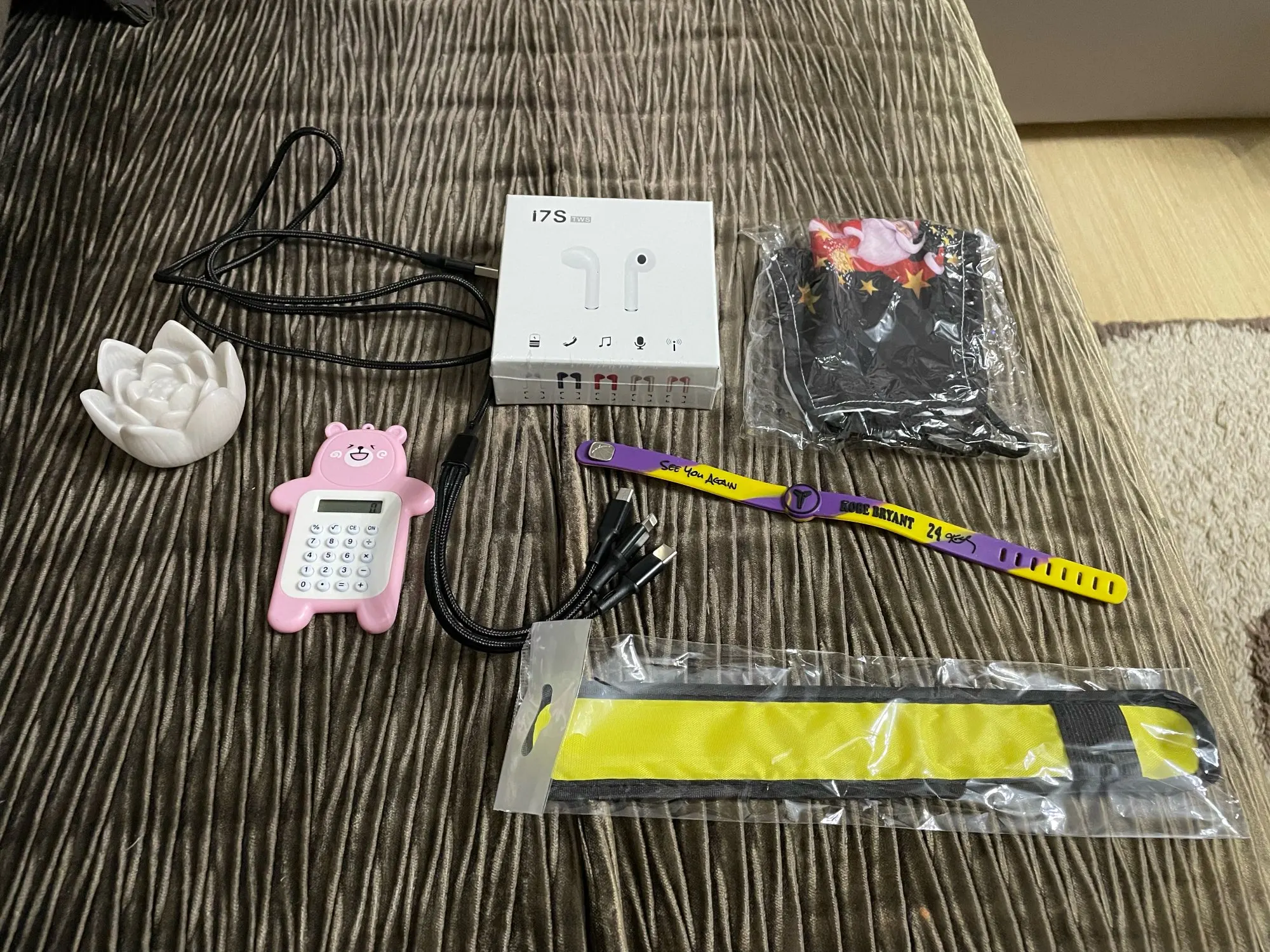 не знаю, что конкретно пришло в этой коробке) но я довольна)) мелочь, а приятно. выкладываю общее фото)) заказала 3 посылки: 2 шт по 303 рубля и одна 572 рубля. в посылке 1 браслет резиновый, второй браслет под кожу с застёжками, третий браслет светящийся, часы детские, фигурка Тора, маска тканевая новогдняя, юсби кабель для Айфона, наушники под Айр подс называются в блютуз i12 , звучание в них хорошее.