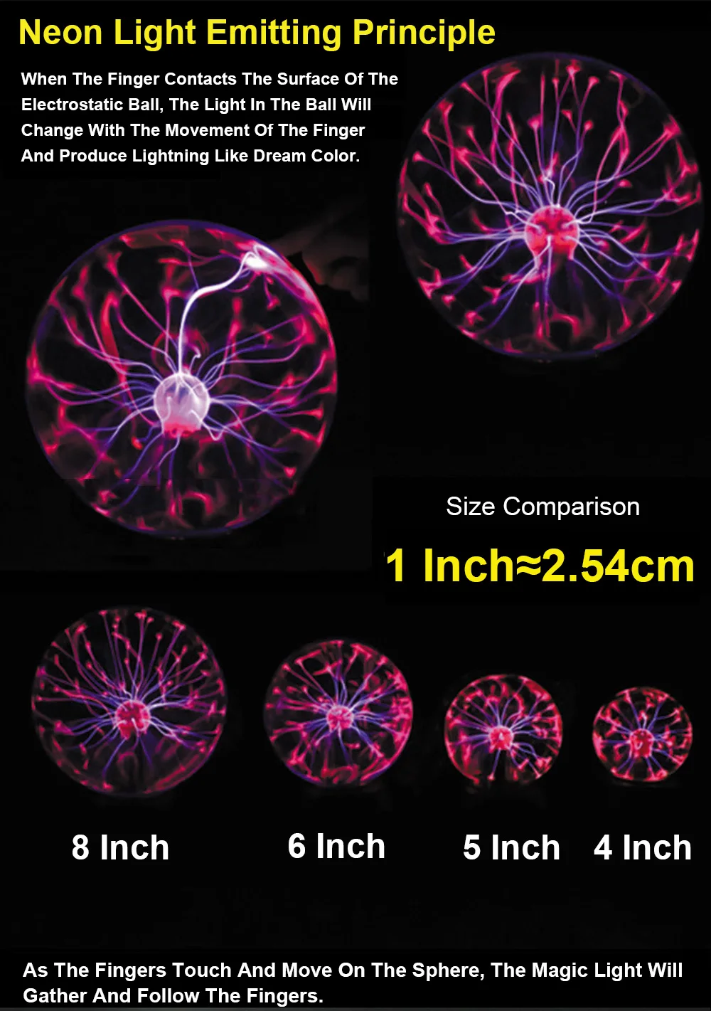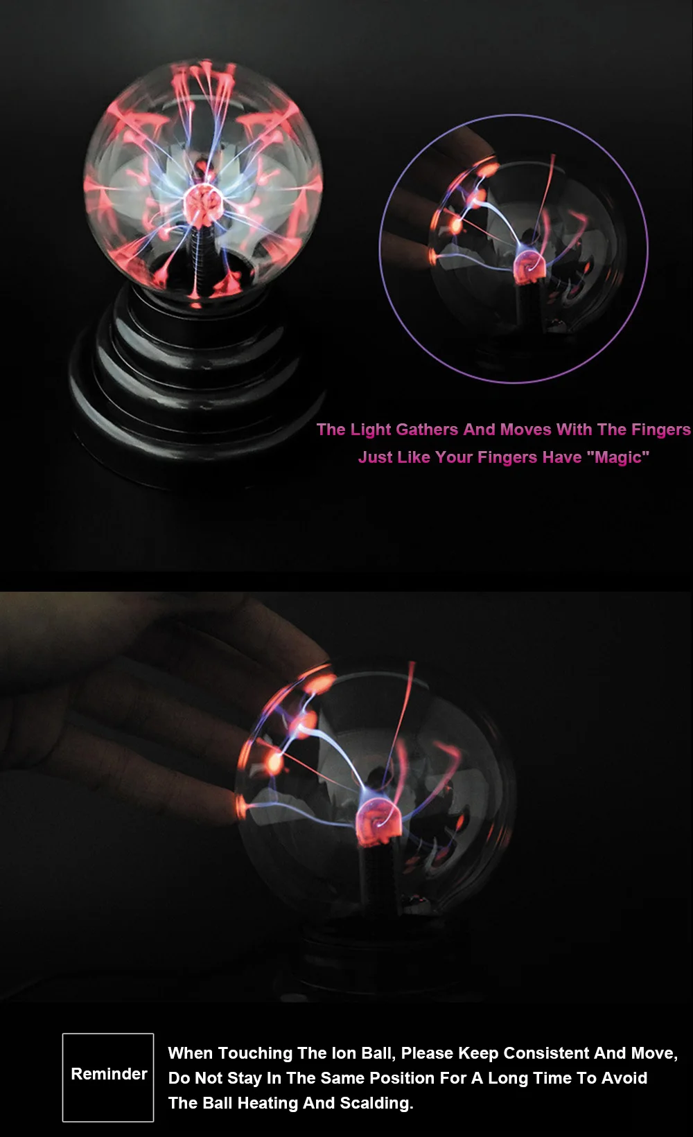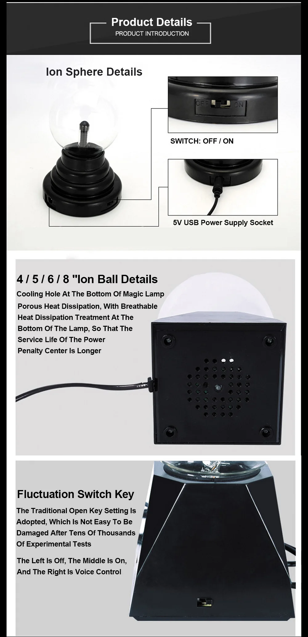 Источник питания Usb, его корпус-это высокопрочный стеклянный корпус, шар наполнен тонким инертным газом, а в центре стеклянного шара находится черный Сферический электрод. В нижней части мяча есть осциллирующая печатная плата. Благодаря преобразователю питания низковольтный постоянный ток 5 в трансформируется в высоковольтное и высокочастотное напряжение, которое применяется к электроду. После включения, дуга, образованная электродом и высоковольтным возбуждаемым инертным газом, генерирует светильник, таким образом, генерируемый светильник похож на сияющее свечение, яркое и сияющее, очень красиво в темноте.