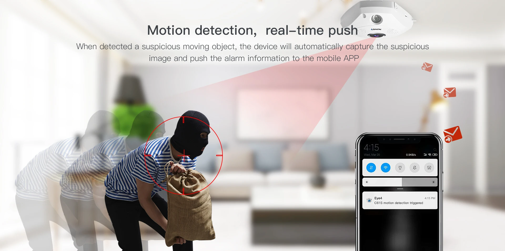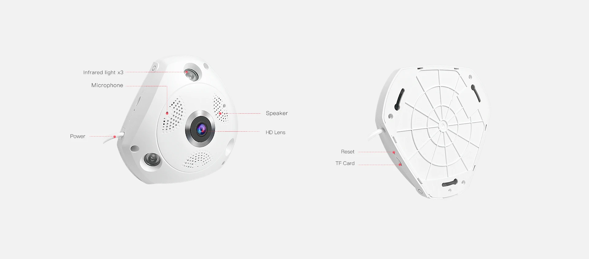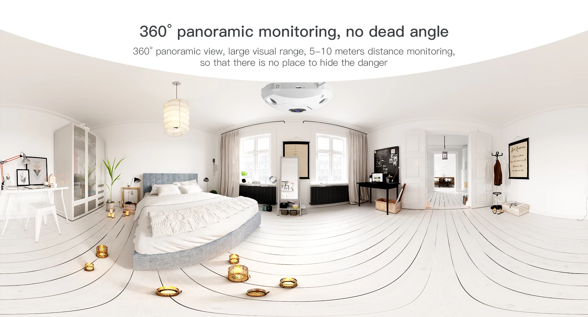 [Панорамная камера 360 °]-Горизонтальные и вертикальные углы обзора линз «рыбий глаз» имеют 180 ˚, что обеспечивает защиту вашего дома с панорамным обзором 360.
