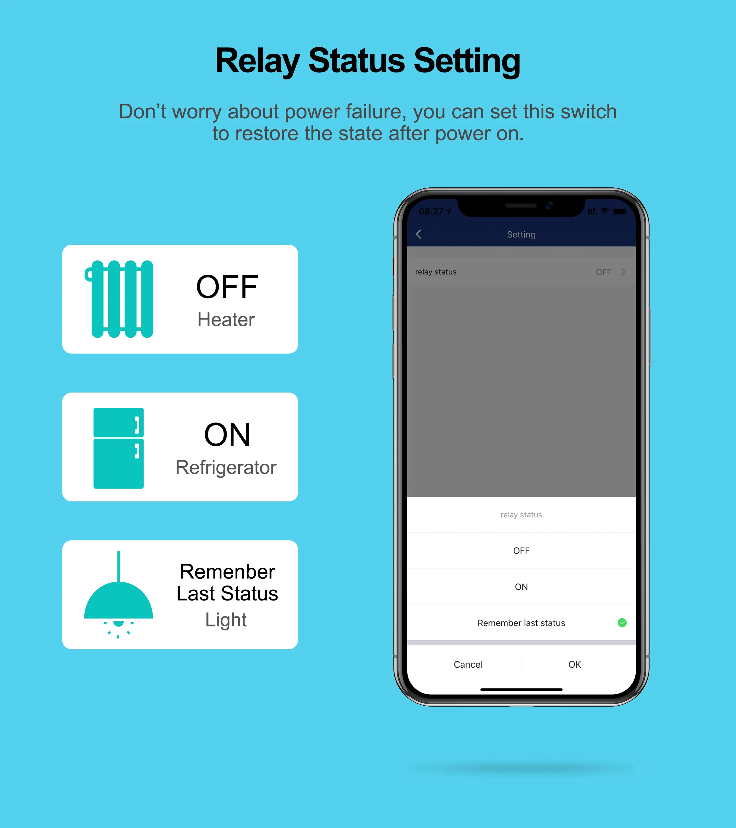 Никогда не беспокойтесь о сбое питания, вы можете установить этот переключатель, чтобы восстановить состояние после включения питания.