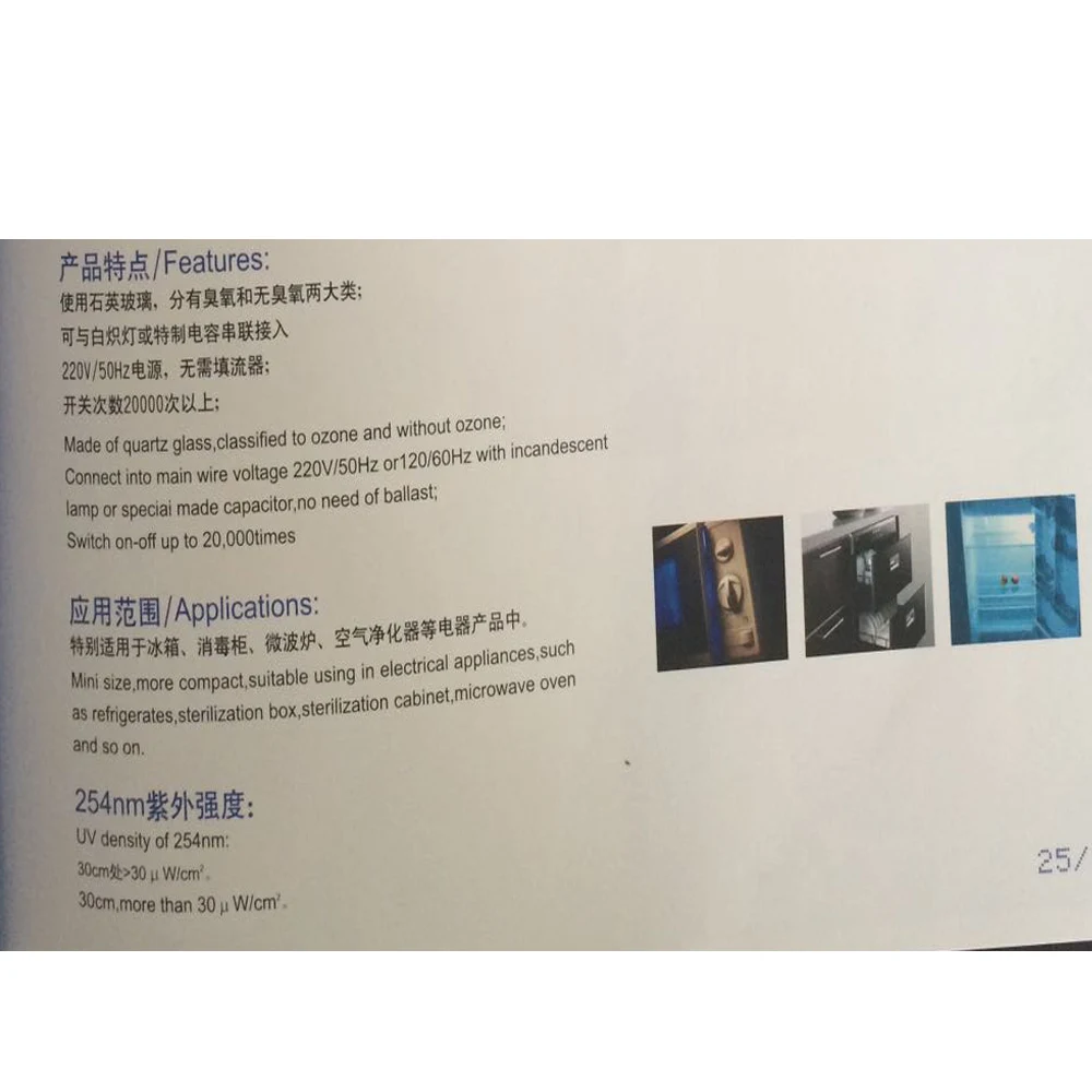 1. Изготовлен из кварцевого стекла, озона и без озона; Подключить в основной провод напряжение 220V/50Hz or120/60Hz светильник с лампой накаливания или специальный конденсатор с алюминиевой крышкой, нет необходимости балласт; переключатель ВКЛ-ВЫКЛ до 20000 раз