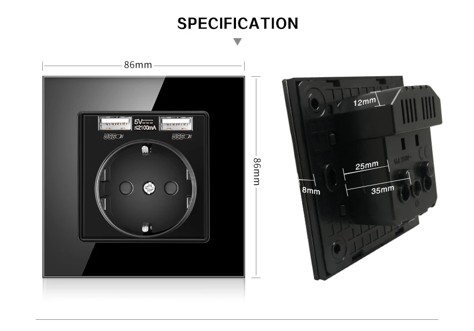 1. Настенная розетка используется для питания мобильных телефонов, цифровых продуктов и других электрических эквивалентов.2. Этот продукт должен быть установлен профессиональным электриком.3. Он широко используется во многих местах, таких как: отель, ресторан, дом, общественные места.4. Материал: панель гнезда-пластиковый материал ПК, огнеупорный чехол для ПК.5. Цвет: белый/золотой/черный.6. Квадратная Модель: 86.7 、 Вход Напряжение: AC 110-250V 50/60Hz Максимальный ток: 16A.8. Размер панели: 86x8 6 мм/3,39x3,39 дюйма9. Упаковка в коробке: 1 шт. + 2 винта.