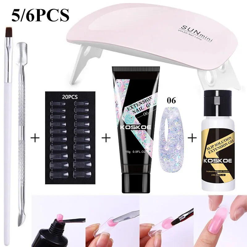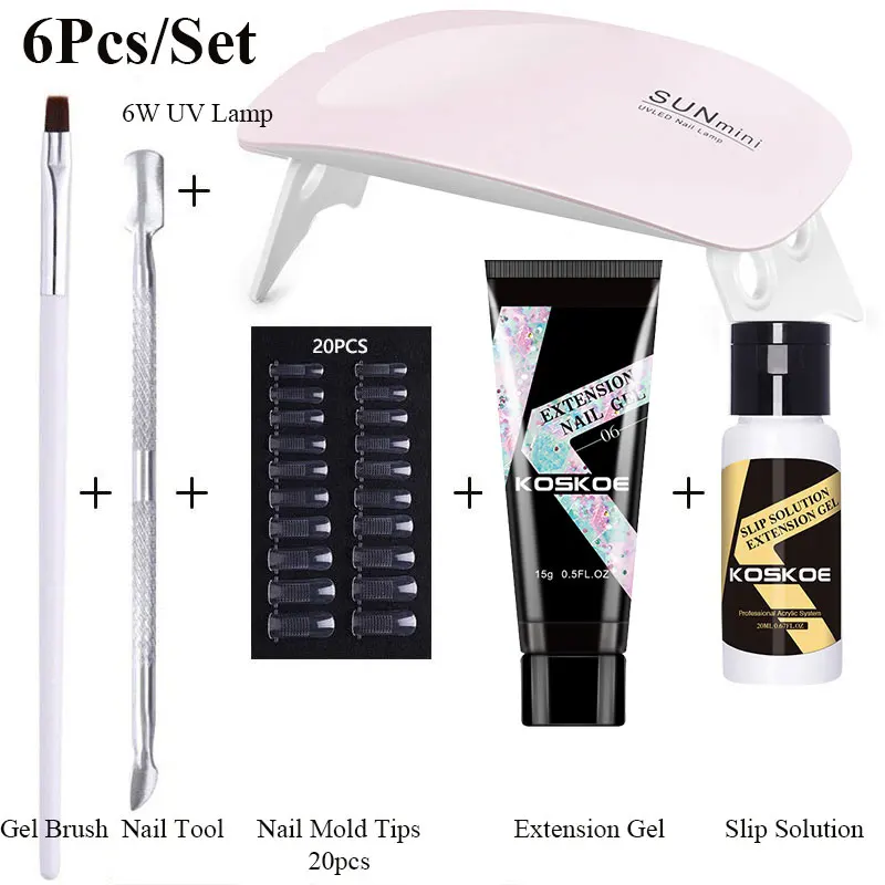 6 шт. посылка:1 шт. 6 Вт УФ-лампа1 шт. KOSKOE 15 г гель для наращивания ногтей1 шт. KOSKOE 20 мл раствор скольжения1 шт. гелевая щетка1 шт. инструмент для ногтей1 мешок для ногтей (20 шт)