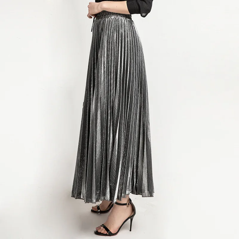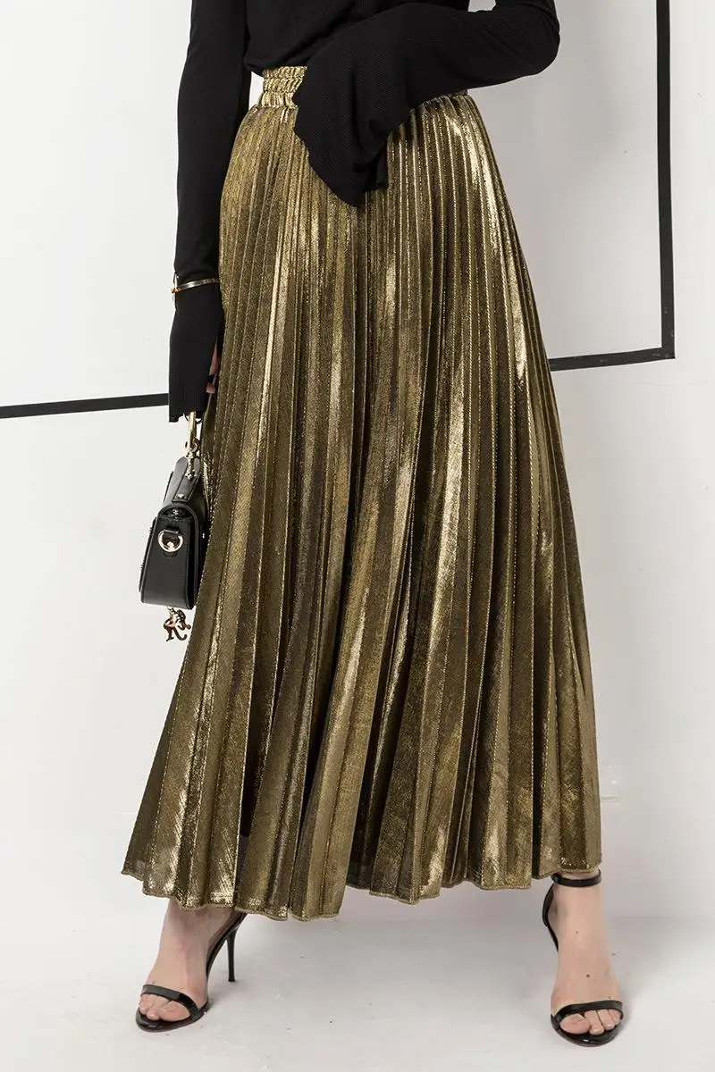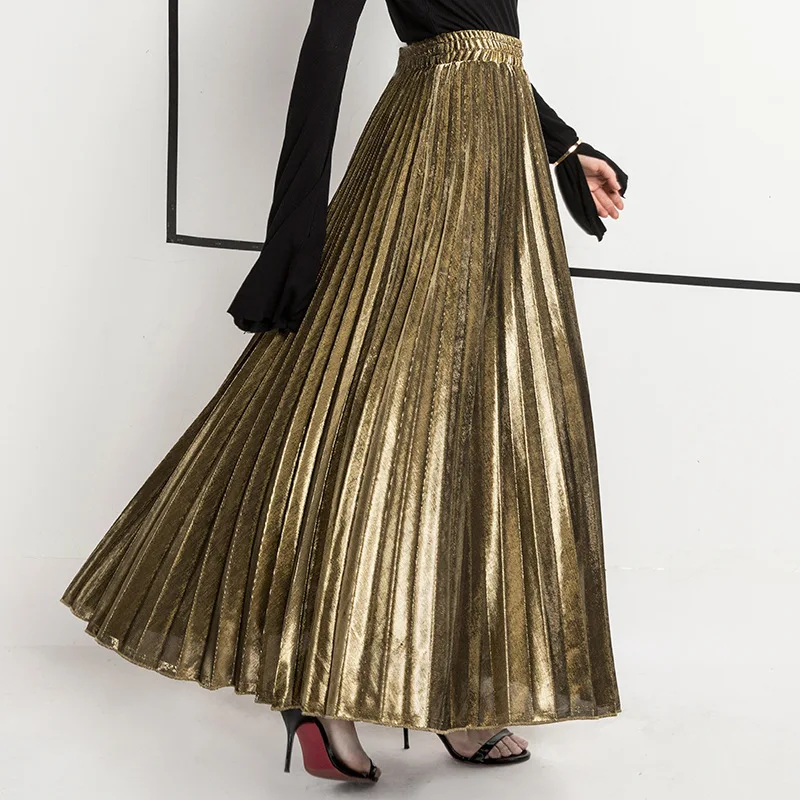 Весенняя металлическая плиссированная юбка макси с высокой талией Harajuku большие золотые длинные юбки для женщин большие размеры XXL Saia