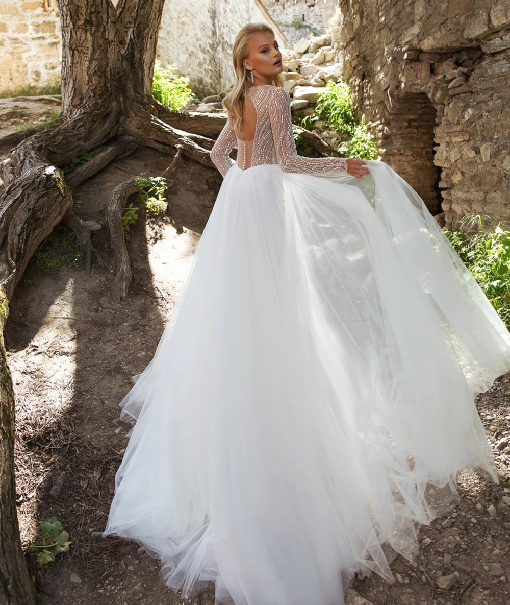 Элегантные тюлевые Свадебные платья для женщин, трапециевидные платья с длинным рукавом, кружевные бриллианты, платье для женщин