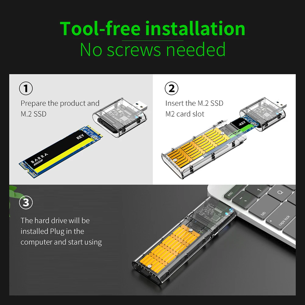 Установка без инструментов, винты не требуются. 1. Подготовьте продукт и M.2 SSD; 2. Вставьте SSD M.2 в слот для карты M2; 3. Вставьте продукт с установленным жестким диском в компьютер и начните использовать его.