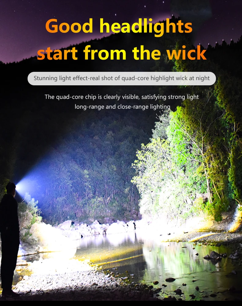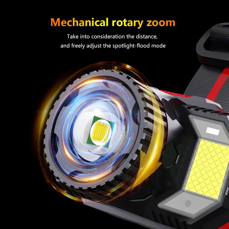4. Морская рыбалка, тяжелый ремонт дождя, наружная аварийная ситуация. Водонепроницаемый и пыленепроницаемый, не боится сильного дождя, легко справиться. Высокая мощность фитиль механический вращающийся зум двойной светильник источник боковой светильник, умный двойной переключатель USB зарядный интерфейс IPX4 водонепроницаемый рейтинг.