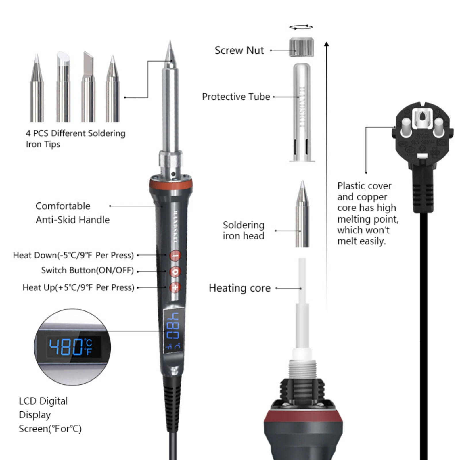 Особенности:-15 минут спустя, он будет автоматически спать, и наконечник защитного паяльника будет поднят.-1 минута до 480 ℃, встроенная PID система.-Диапазон 180-480 ℃ (356-896) одна клавиша для регулировки температуры. Простая транзакция.-Продукт имеет светодиодный дизайн дисплея.Диапазон контроля температуры более точный, с погрешностью ± 2 °C при 180-480 °C.Спецификация:Режим сна: автоматический сон через 15 минутНапряжение: переменного тока (110V / 220V)Диапазон температур: 180-480 ℃Стабильность температуры: около 2 ℃Диапазон компенсации температуры: около 99 ℃Температурная единица: ℃/FНагреватель: четырехъядерный керамический нагреватель PTCДисплей: синий светодиодный Вес нетто: 140 гПосылка включает: