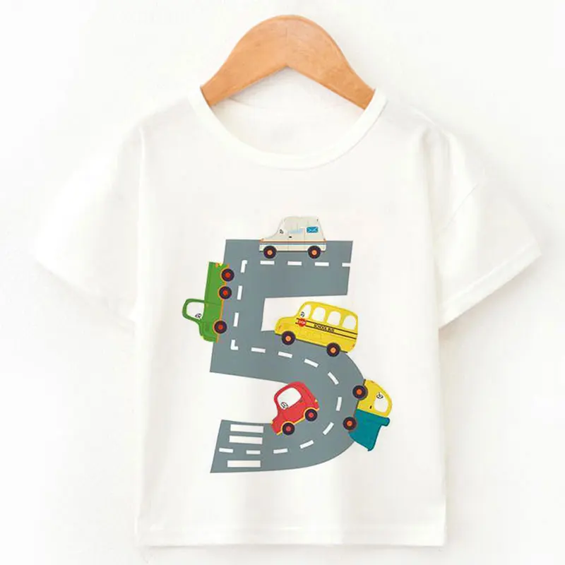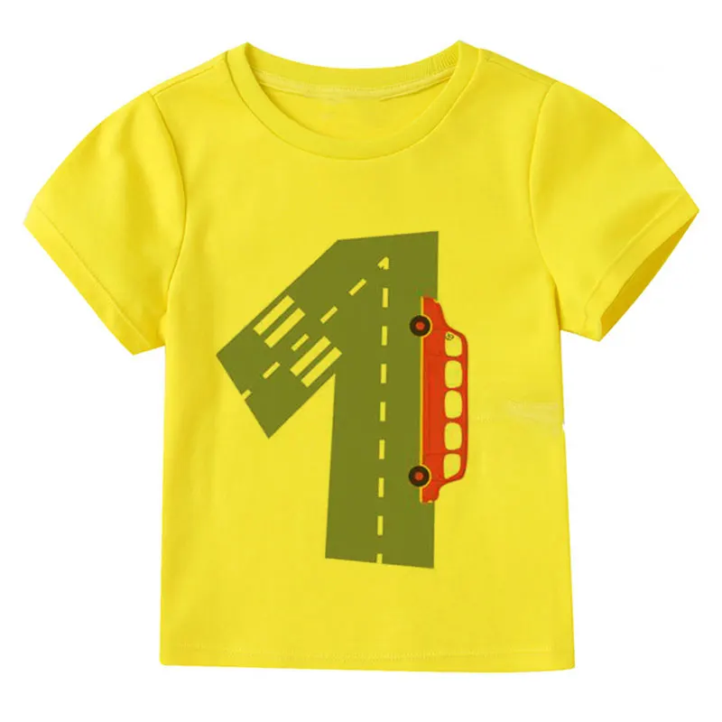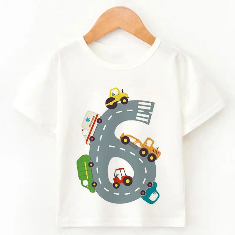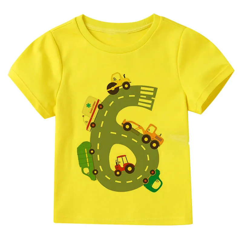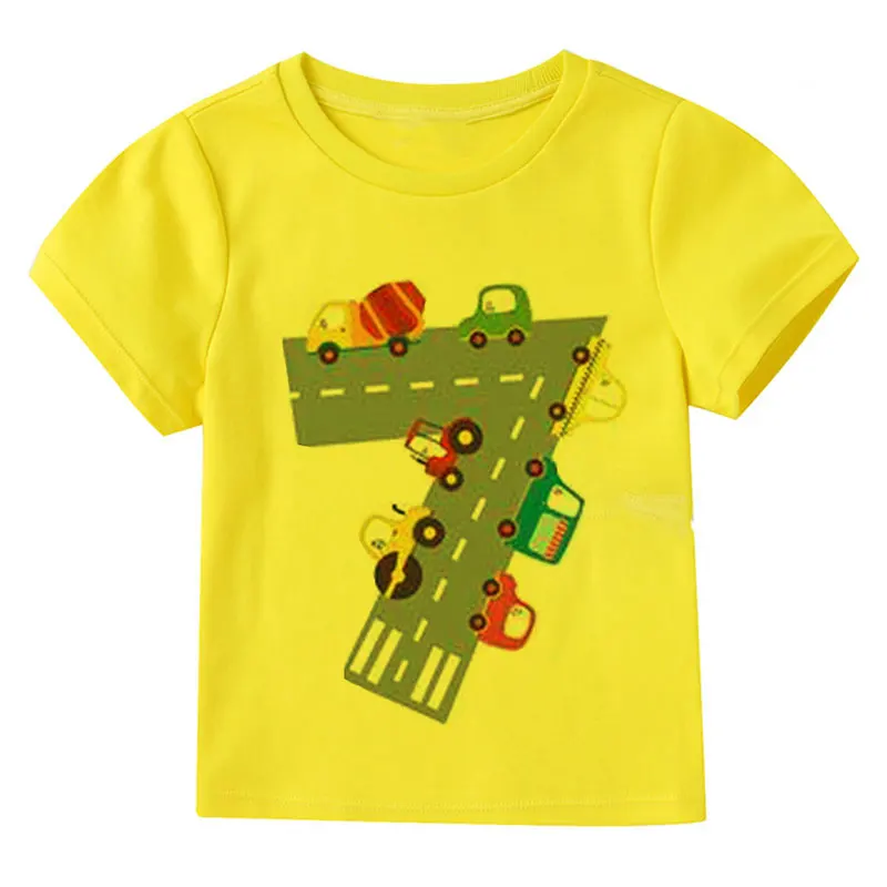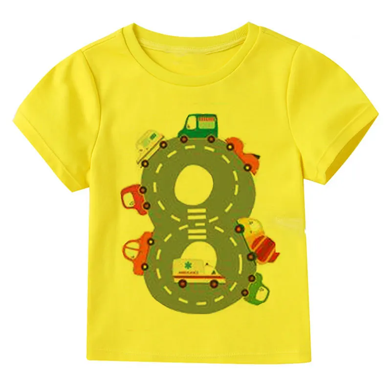 Футболка с мультяшным принтом автомобиля для маленьких детей, для мальчиков и девочек, тонкая летняя одежда с коротким рукавом, белая, желтая, одежда для подарка на день рождения