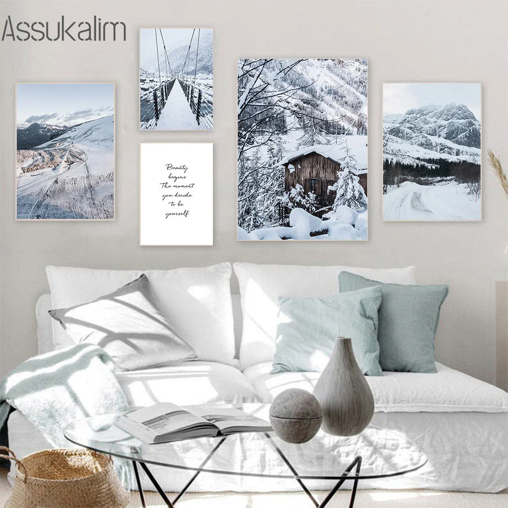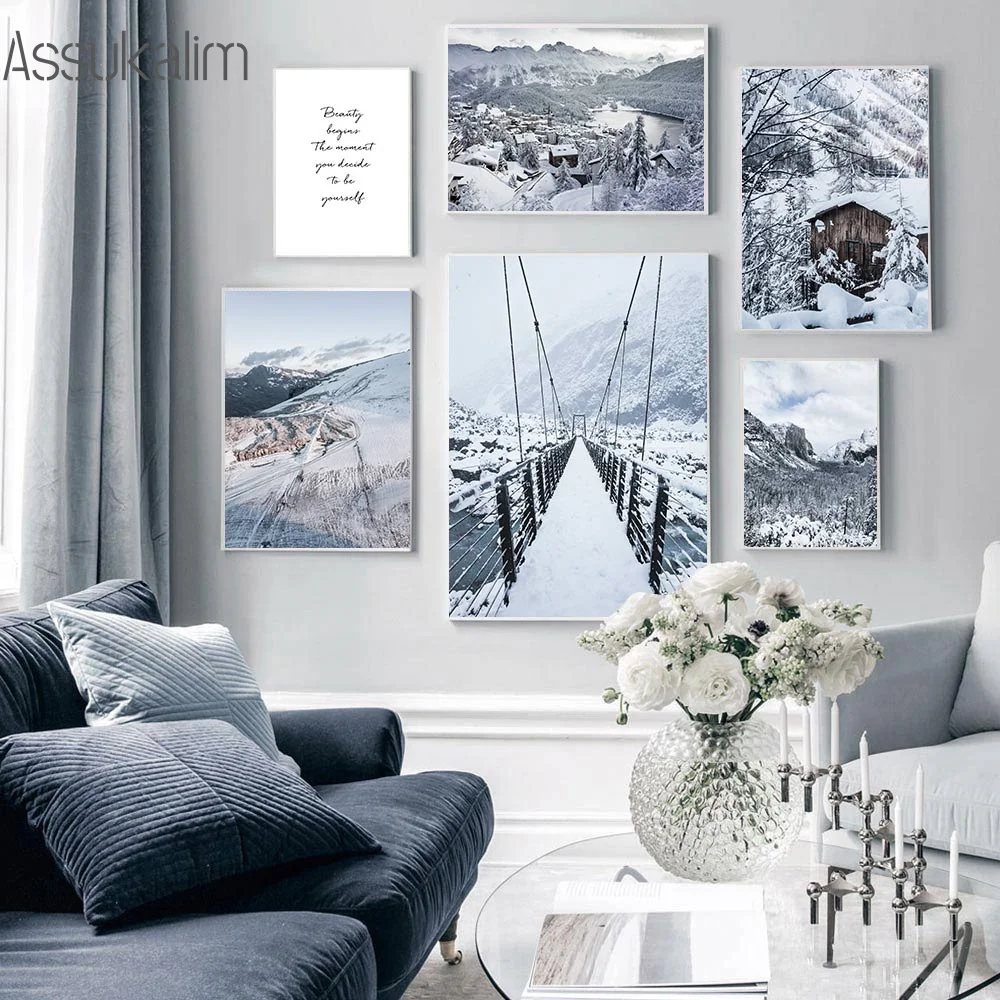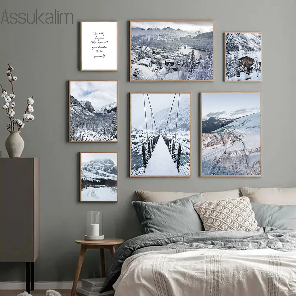 Зимний Снежный холст Художественная живопись озера плакат с изображением моста гор и принты скандинавские настенные картины декор для гостиной