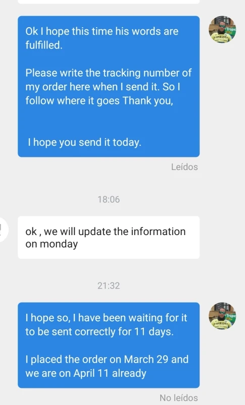 Я сделал заказ на батареи gopro 10 28 марта 29 марта, они возвращают его продавцу. И одиа начинает лгать, иногда, что длилось 13 дней. И в конце концов, говоря, что нет самолетов на Канарские острова, когда я получаю покупки каждые 3 или 4 дня. Спор закрыт с возвратом, и все же деньги не возвращаются. К сожалению худший магазин Не покупай здесь ничего. Надеюсь, они закрыт.